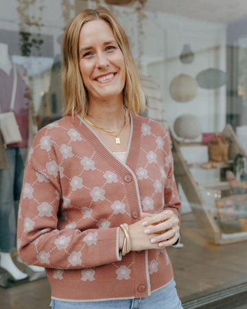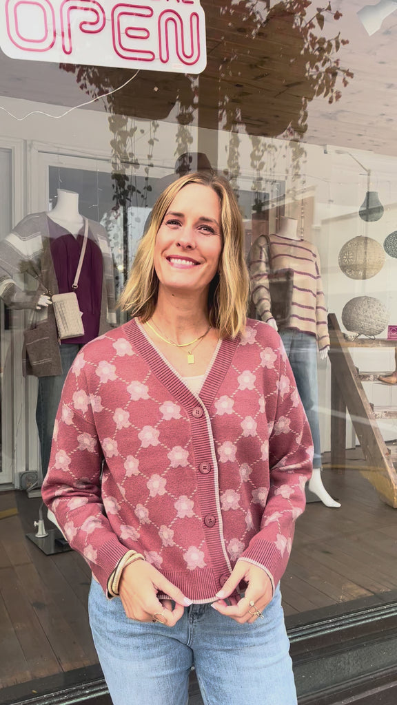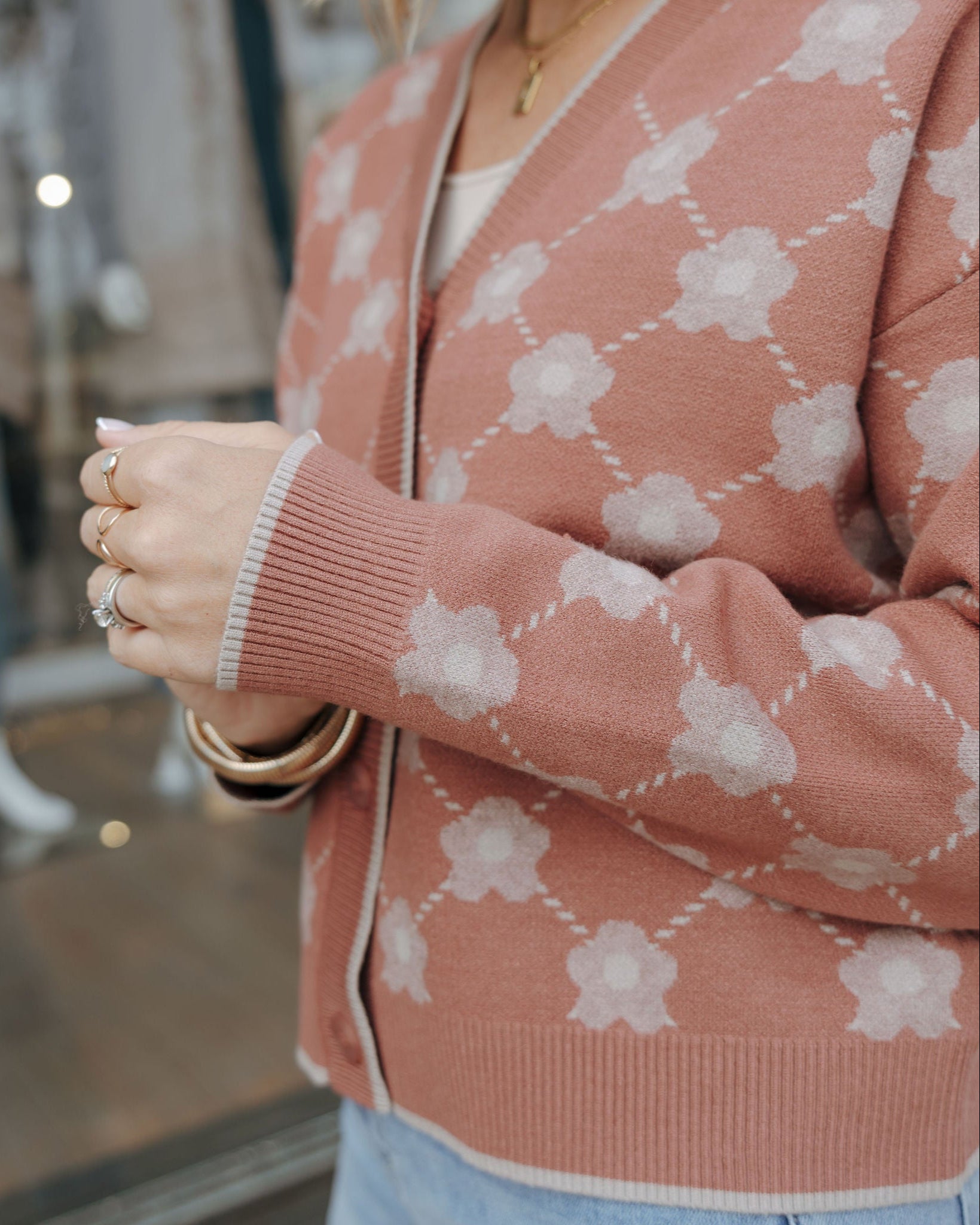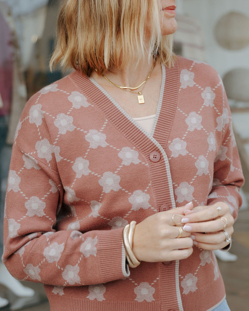 Wrap yourself in cozy charm with the Autumnrise Cardigan. Featuring a playful mix of rosewood and blush tones, this heavy-weight sweater showcases a floral design intertwined with a diamond pattern for a touch of whimsy. The flattering v-neck and button-down front add effortless style, making it perfect for layering through crisp autumn days.