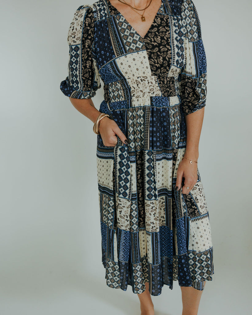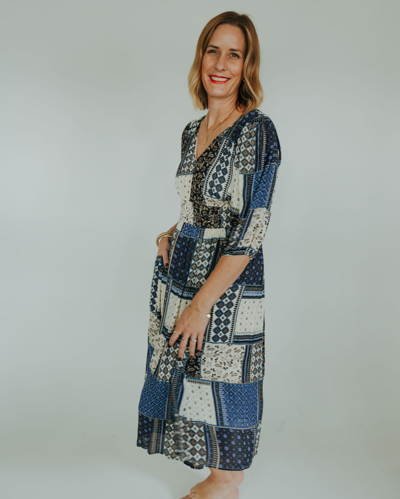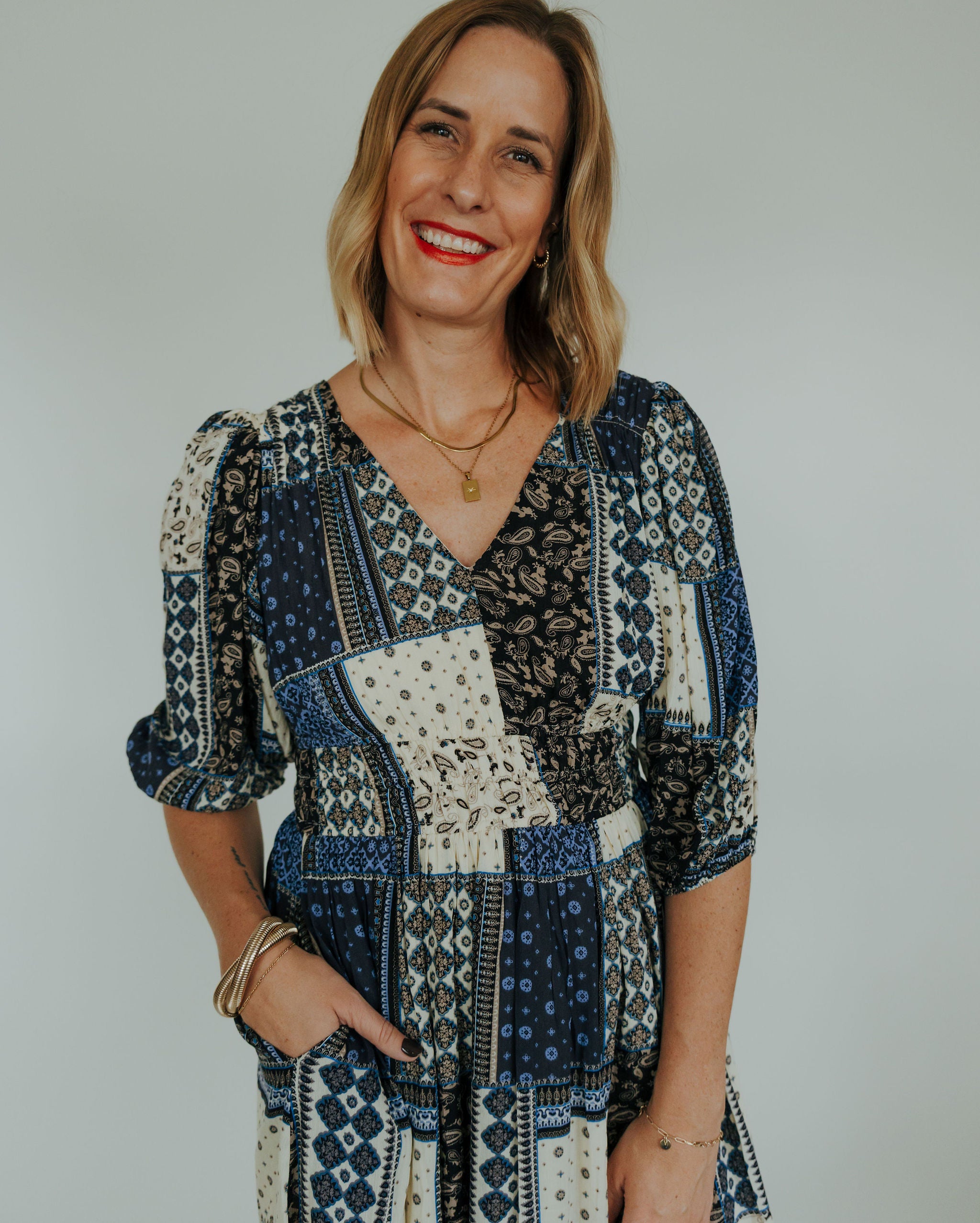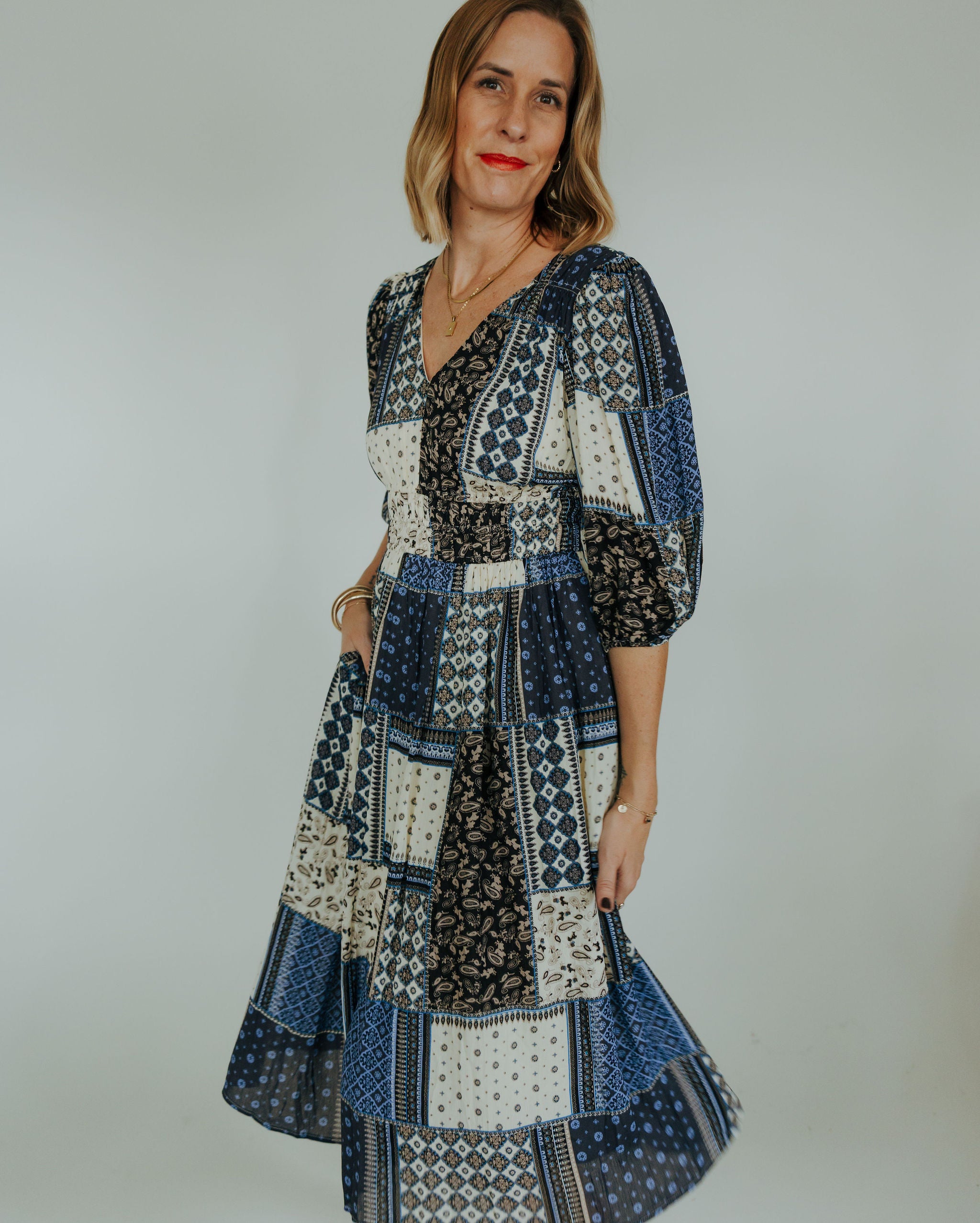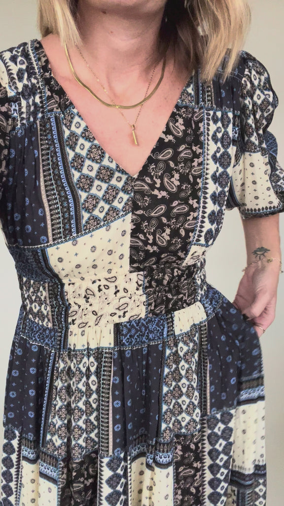 This adorable dress features a flattering V-neck and a pattern you'll love to show off. Complete with handy pockets, it combines playful style and everyday practicality effortlessly. Perfect for twirling through your day with ease!