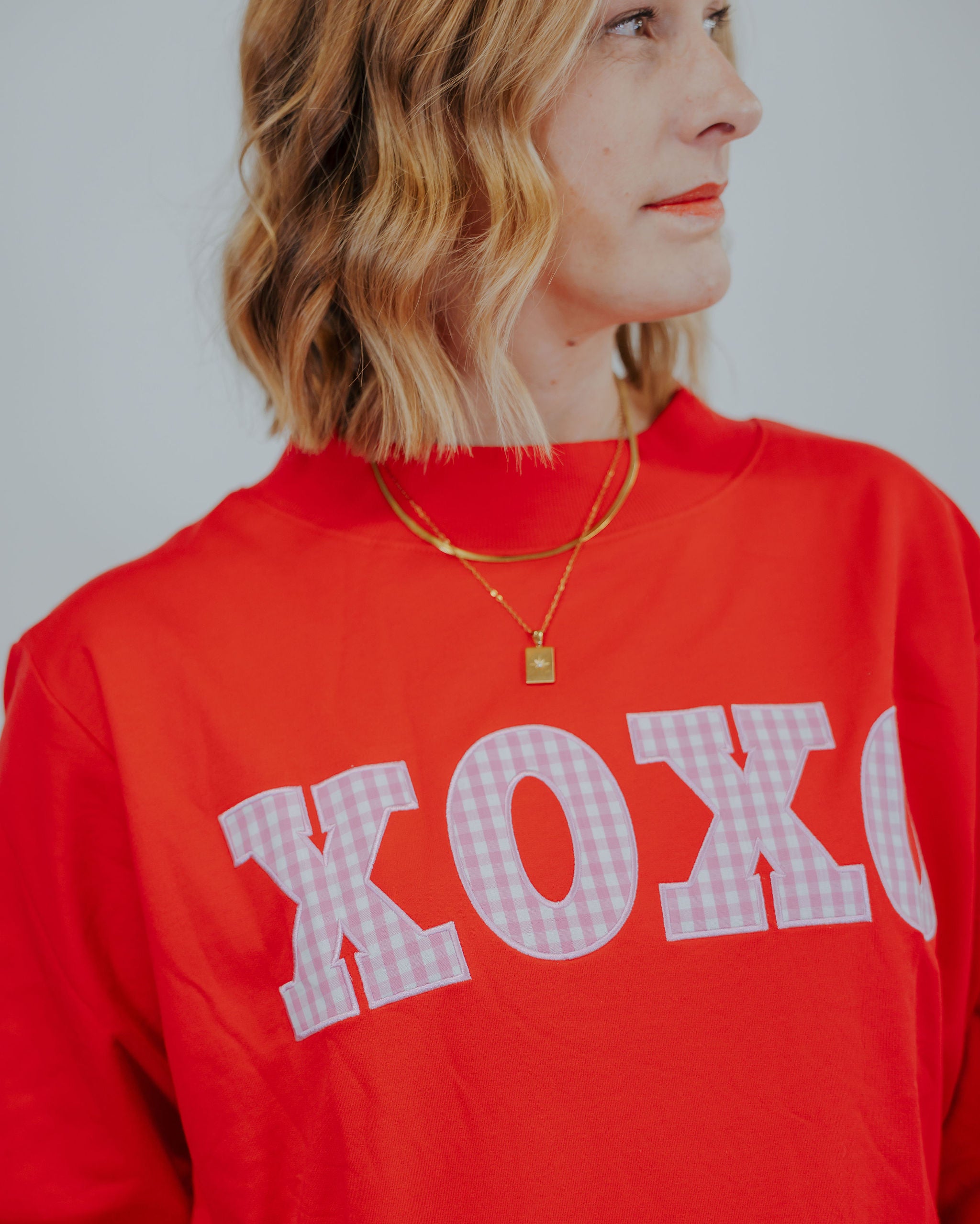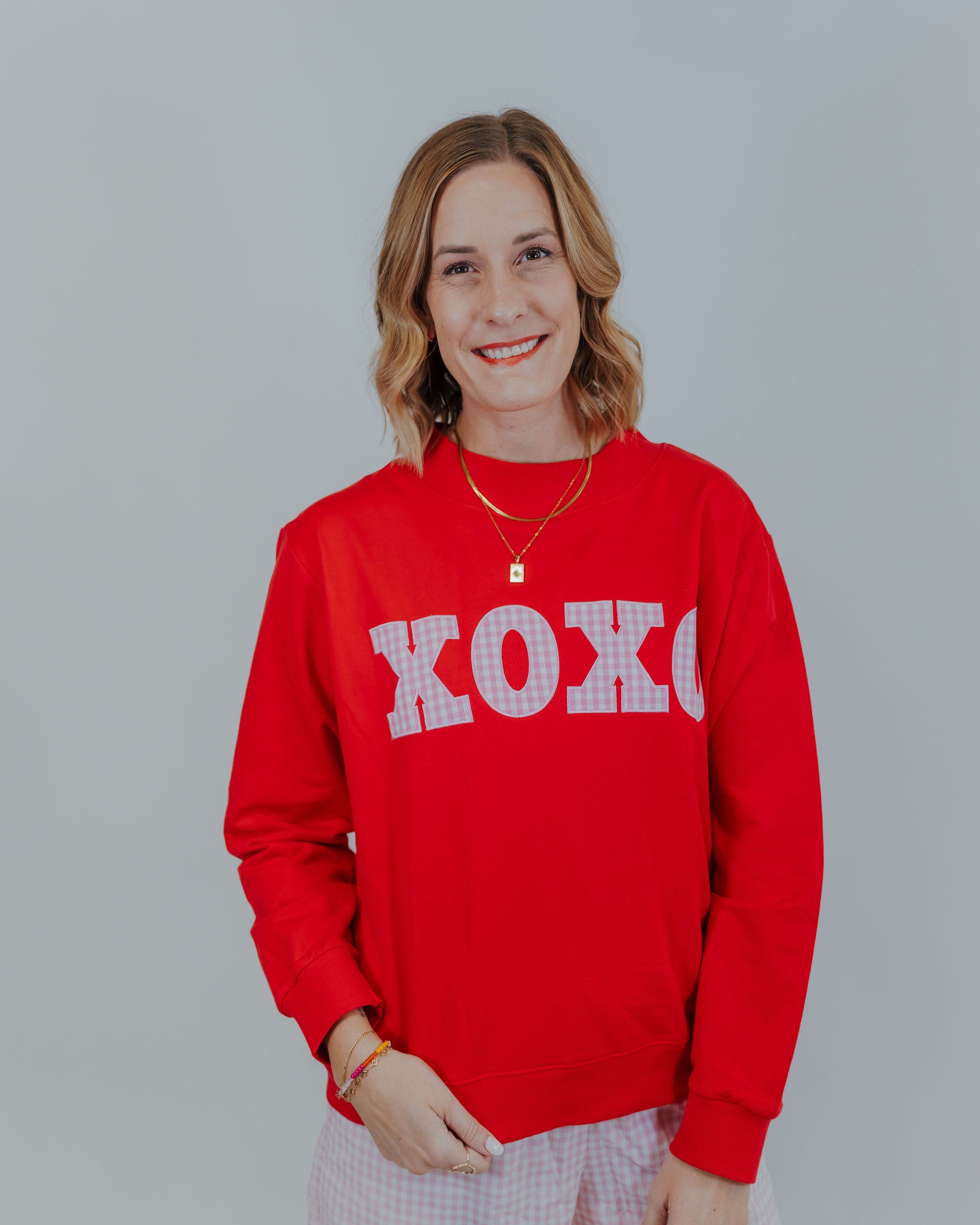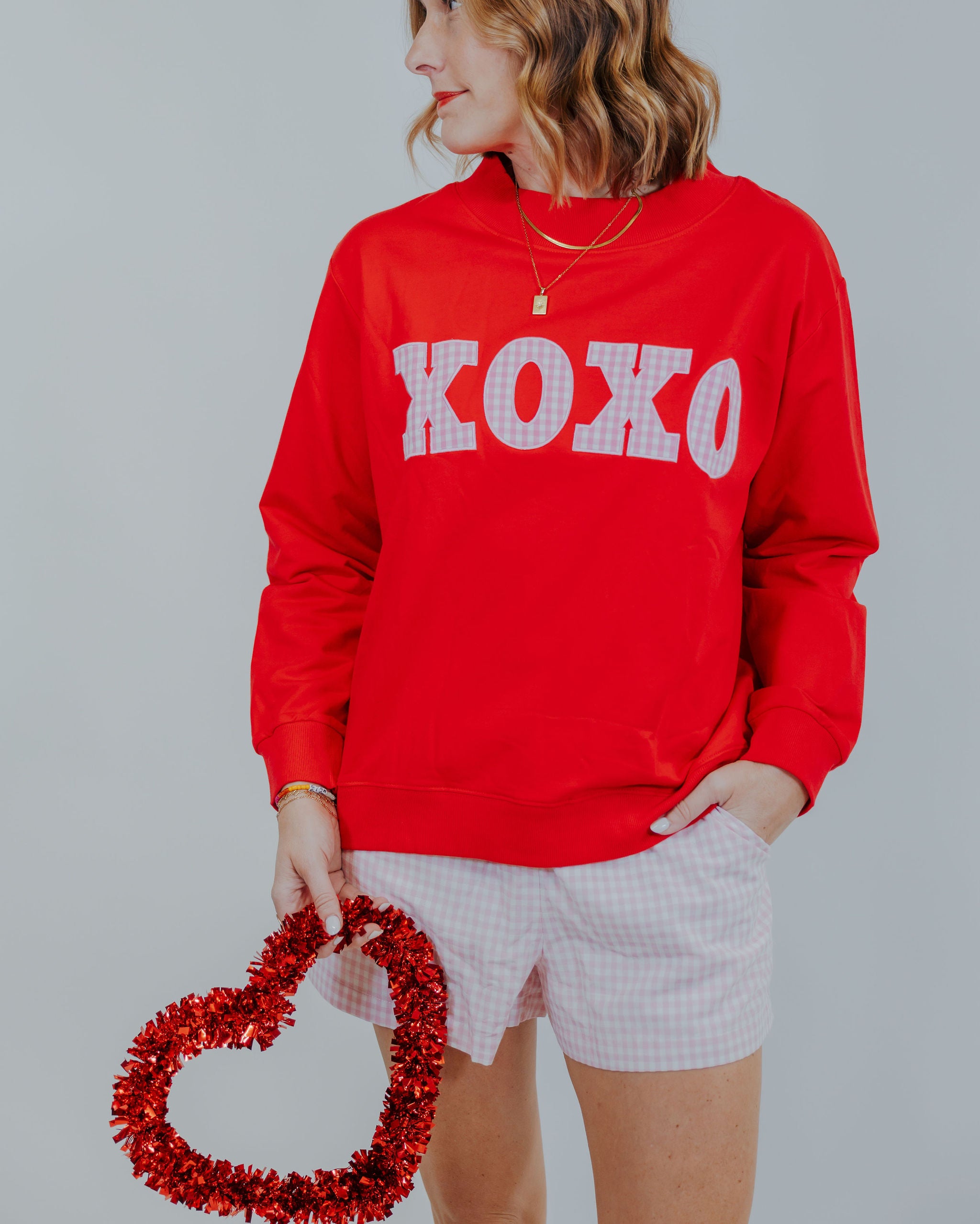 Cozy meets cute in this mock neck sweatshirt featuring an adorable gingham XOXO pattern. The soft, comfortable fabric makes it perfect for layering with a vest or wearing solo, while the playful design adds a flirty touch to your casual rotation.