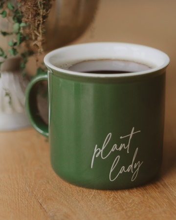 DETAILS: • 11oz Capacity • Campfire Style Mug • Green color with white script "plant lady" design on both sides • Size: 3.75"W x 3.63"H (4.88" w/handle)