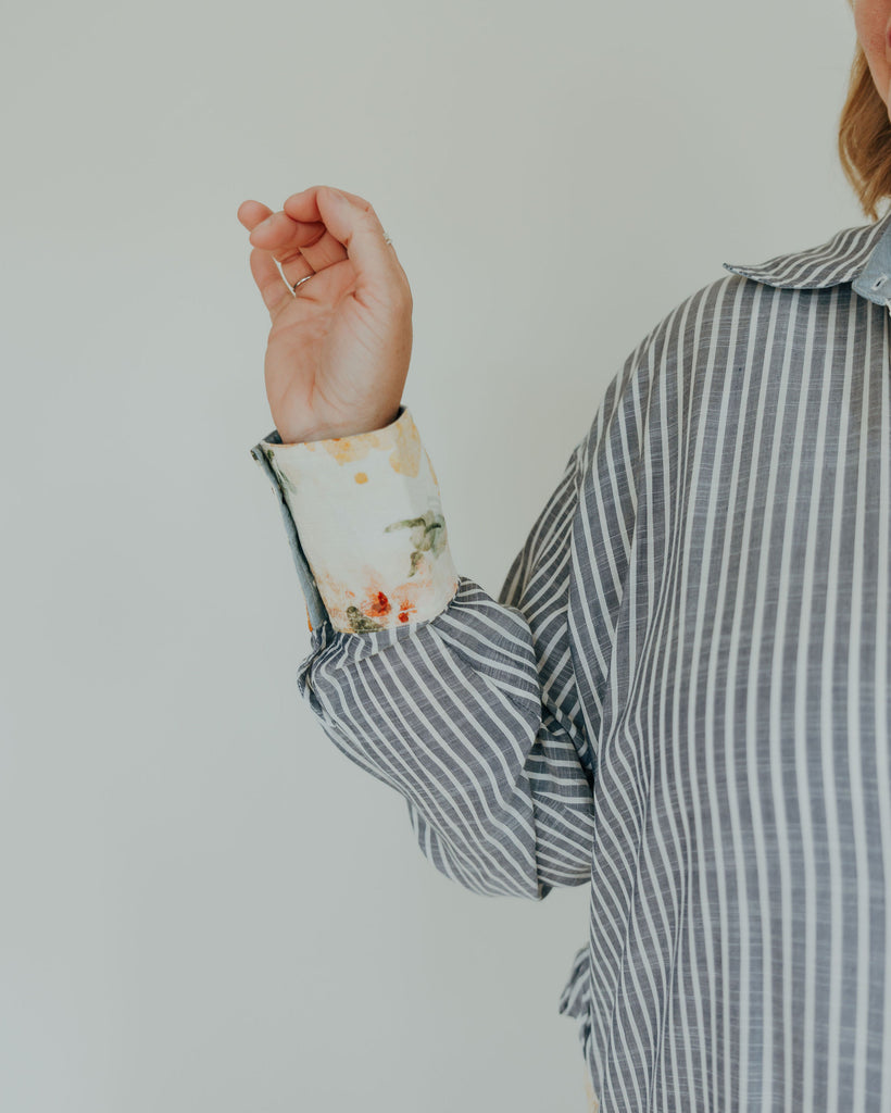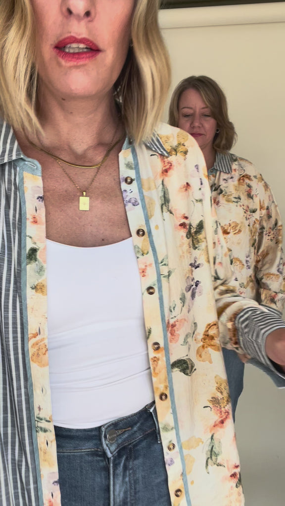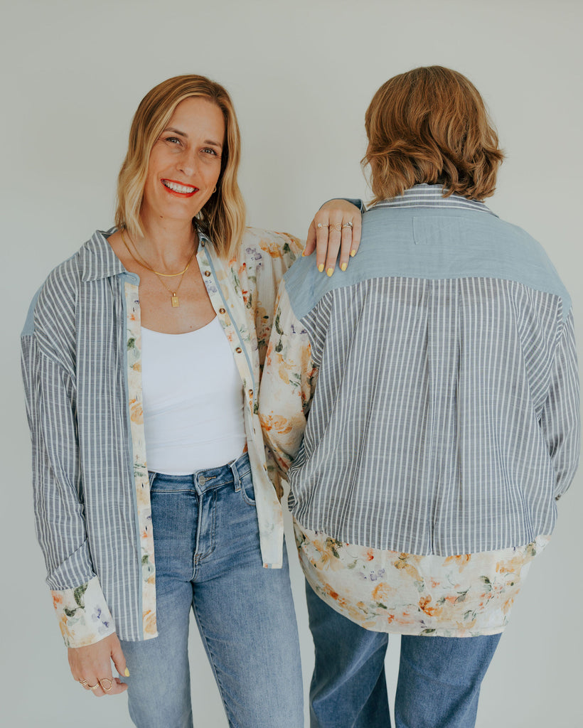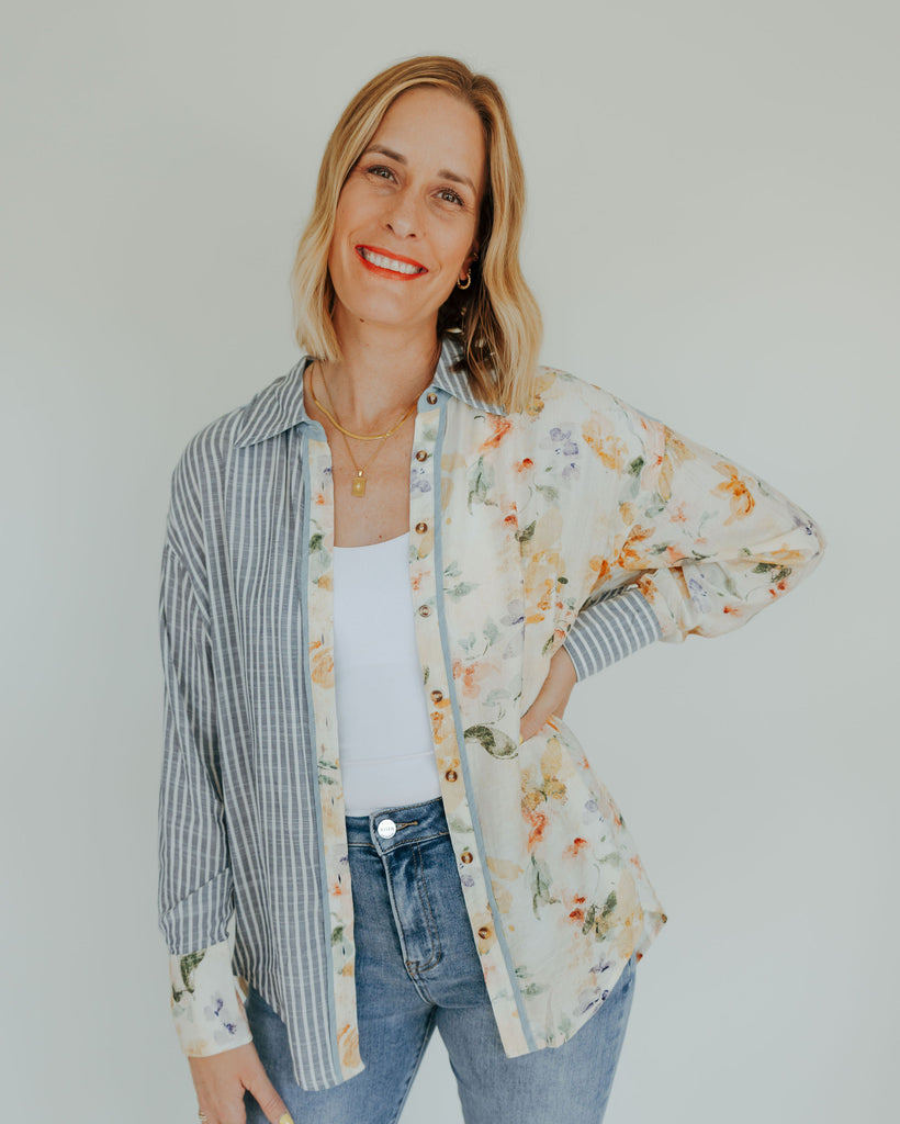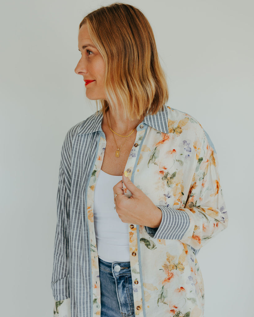 This Mixed Print Button-Down combines playful floral patterns with timeless classic stripes, accented by charming chambray trim for a fresh twist. Its unique design adds a fun, stylish edge to your wardrobe, perfect for those who love to mix prints with a touch of whimsy.