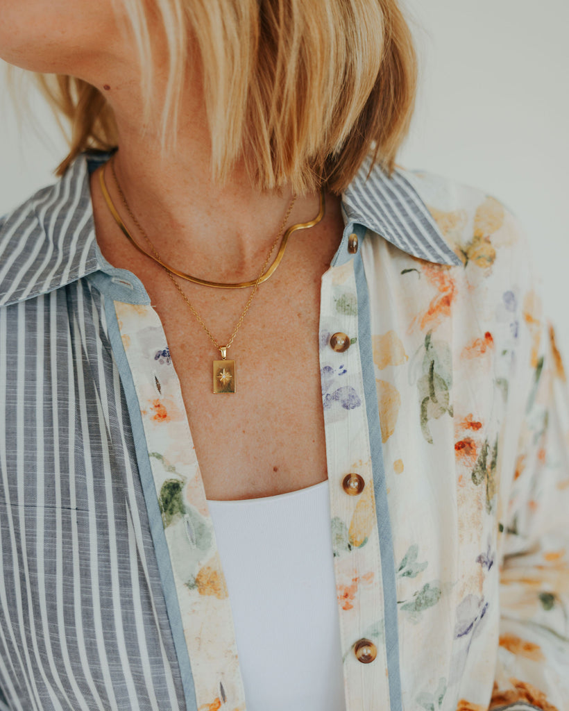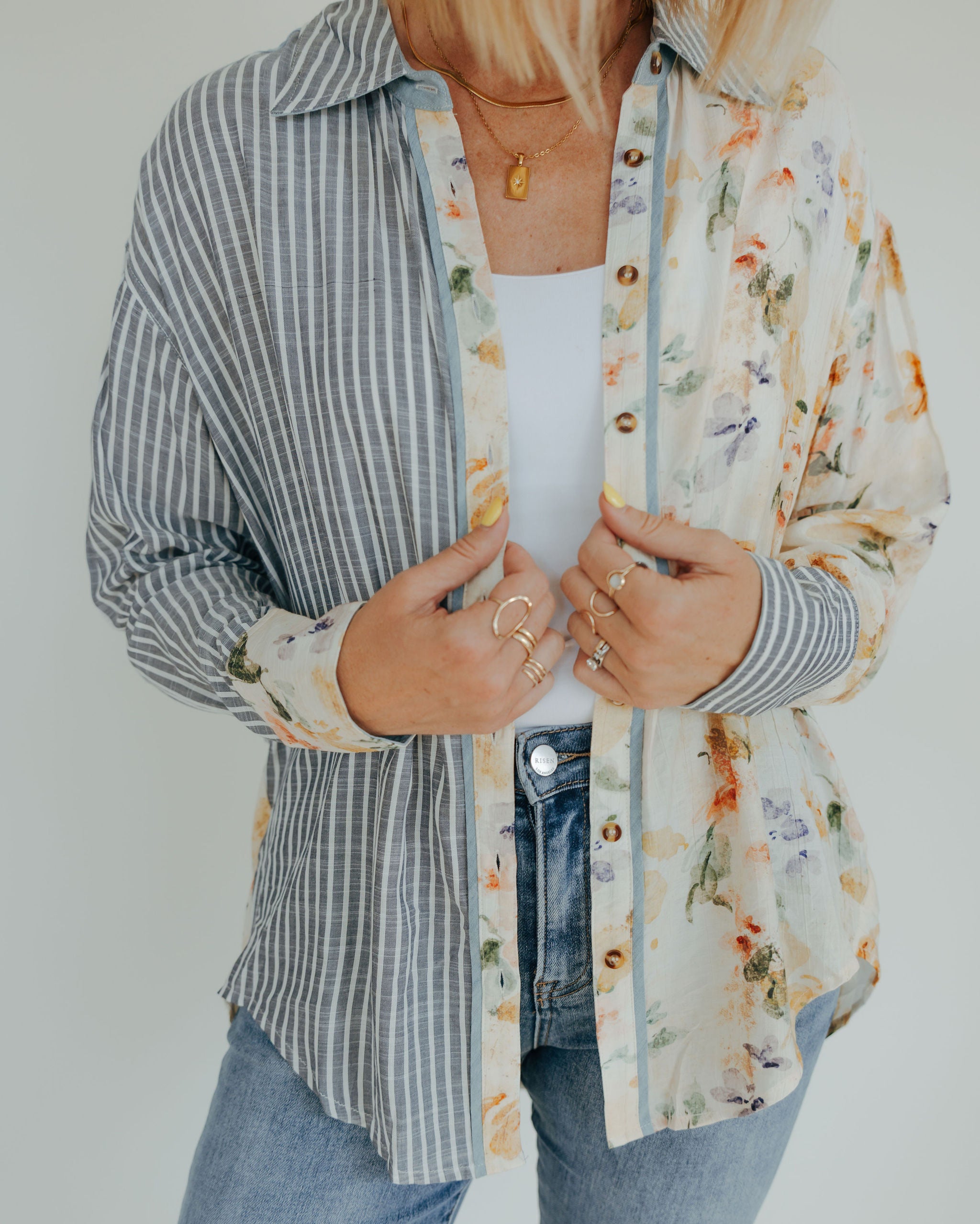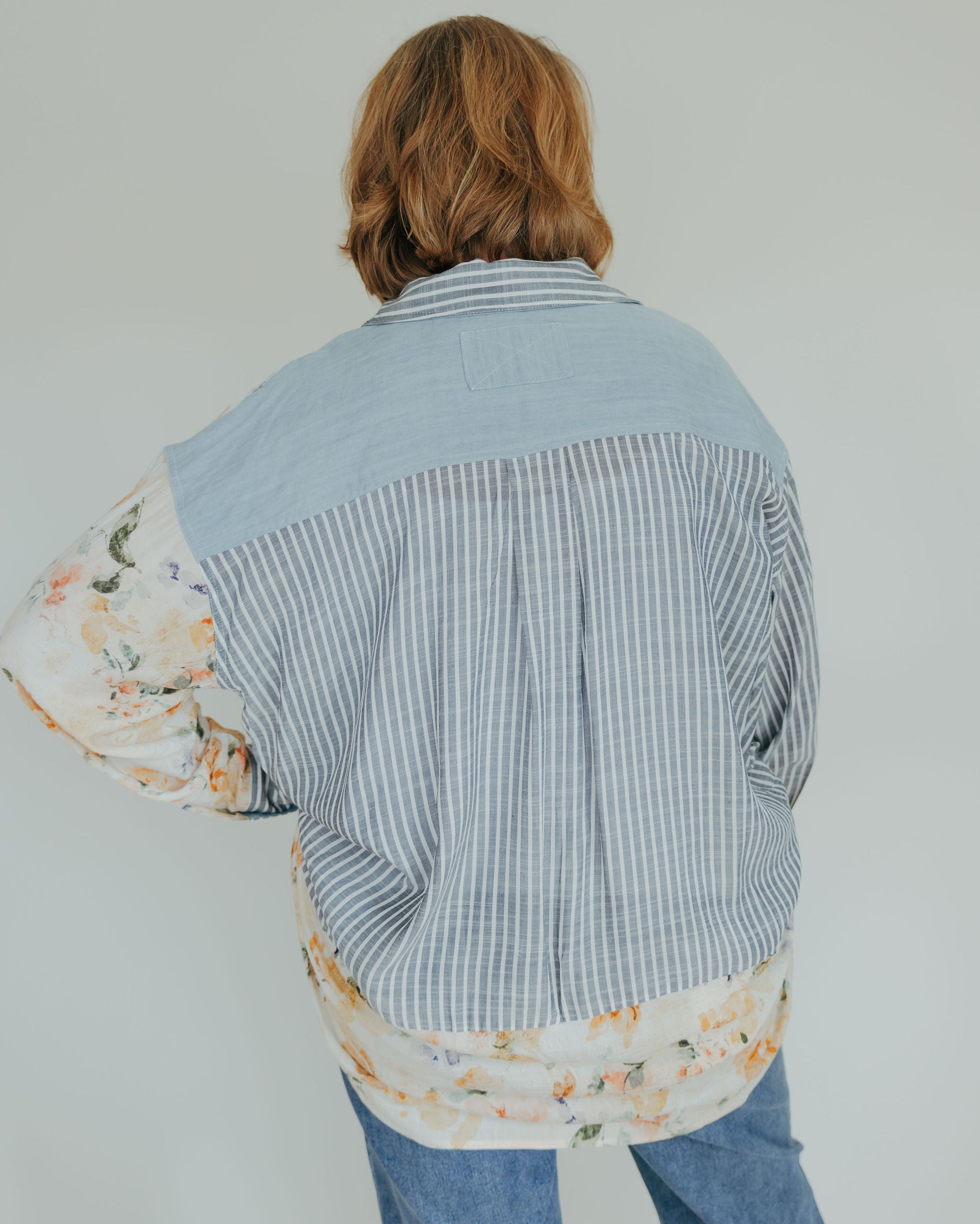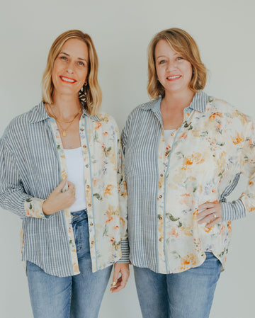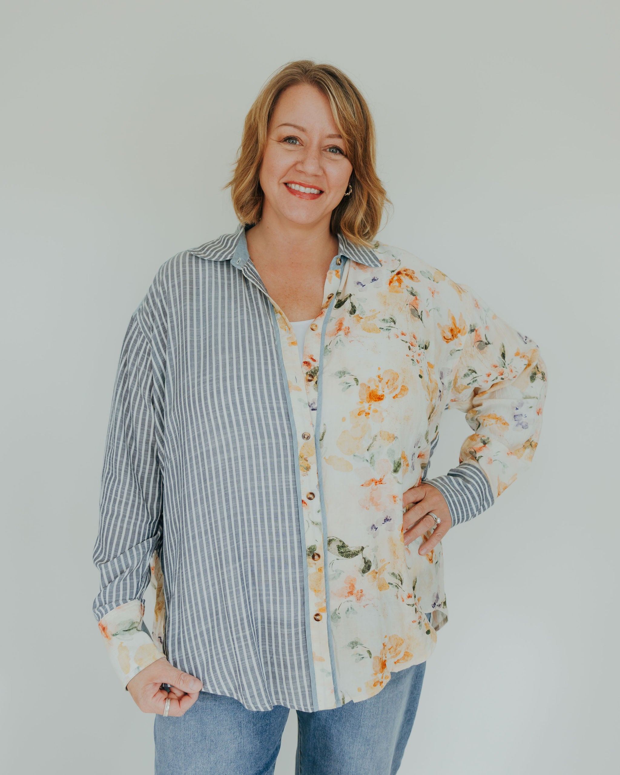 This Mixed Print Button-Down combines playful floral patterns with timeless classic stripes, accented by charming chambray trim for a fresh twist. Its unique design adds a fun, stylish edge to your wardrobe, perfect for those who love to mix prints with a touch of whimsy.