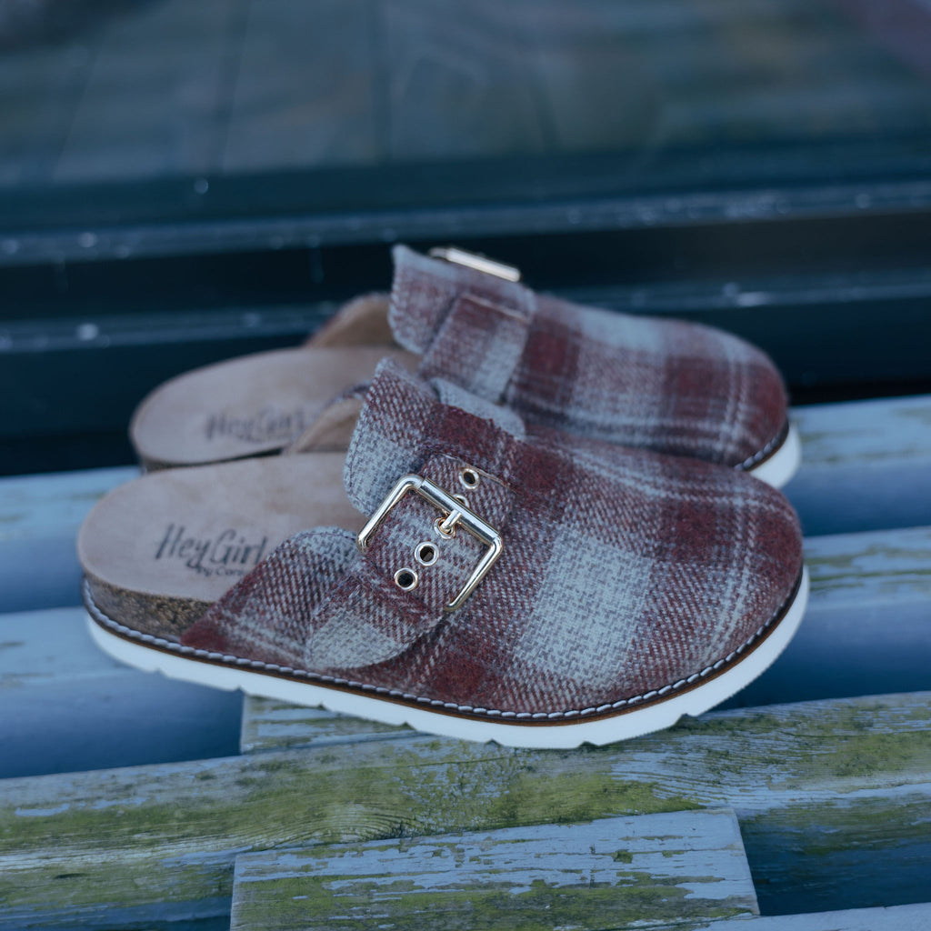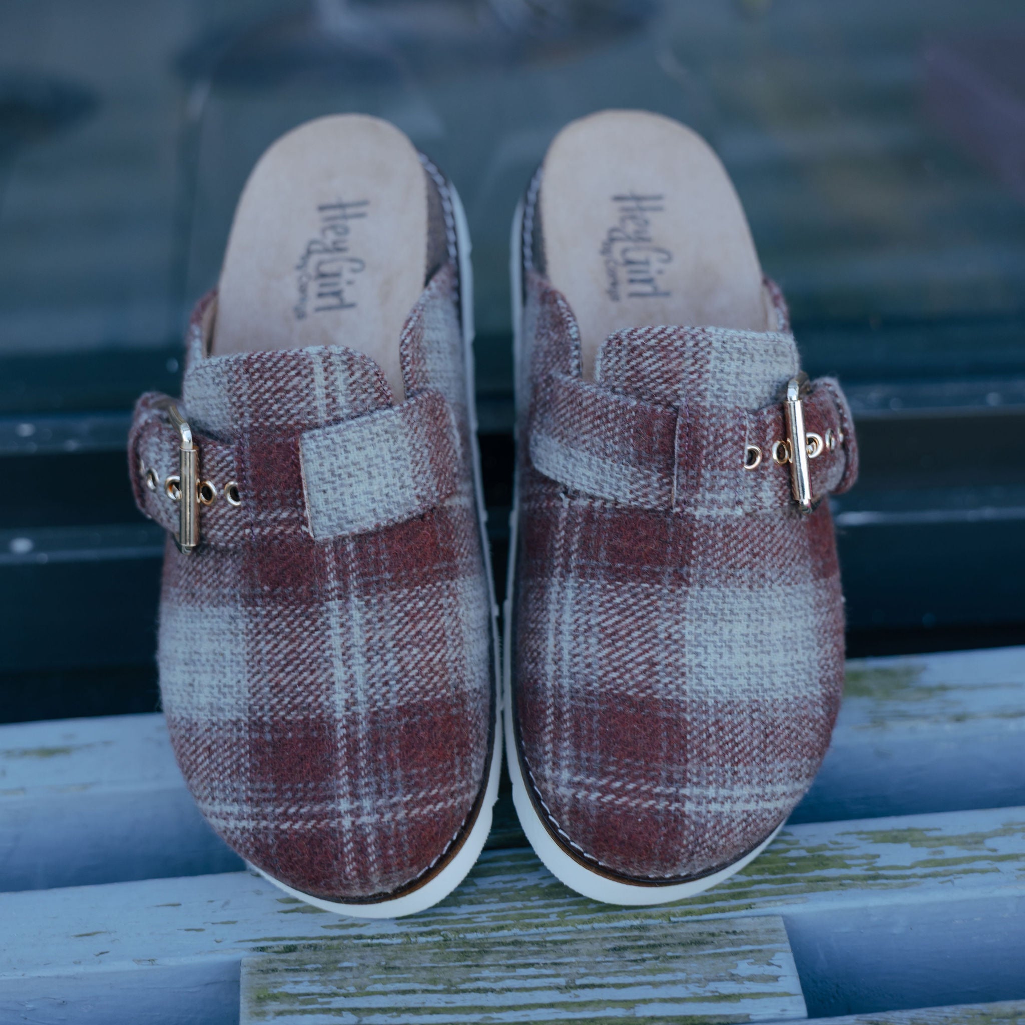 Step into cozy charm with the Day Dream Clog in Rust Plaid. This adorable clog combines playful style with cushy comfort, making every step a dream. Its warm plaid pattern adds a fun, rustic vibe, perfect for lounging or casual outings. Slip these on for an effortless blend of cuteness and comfort all day long.