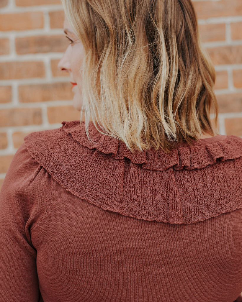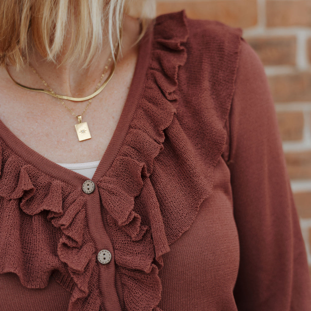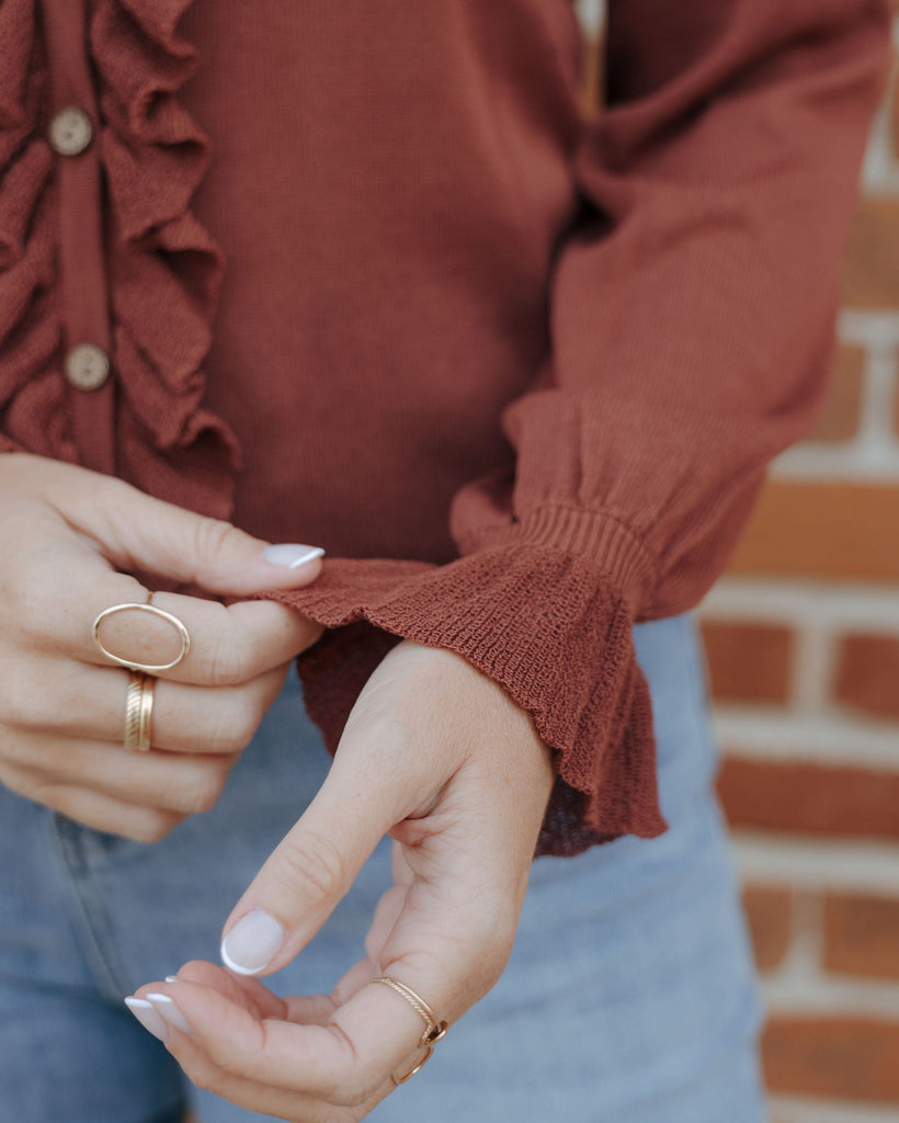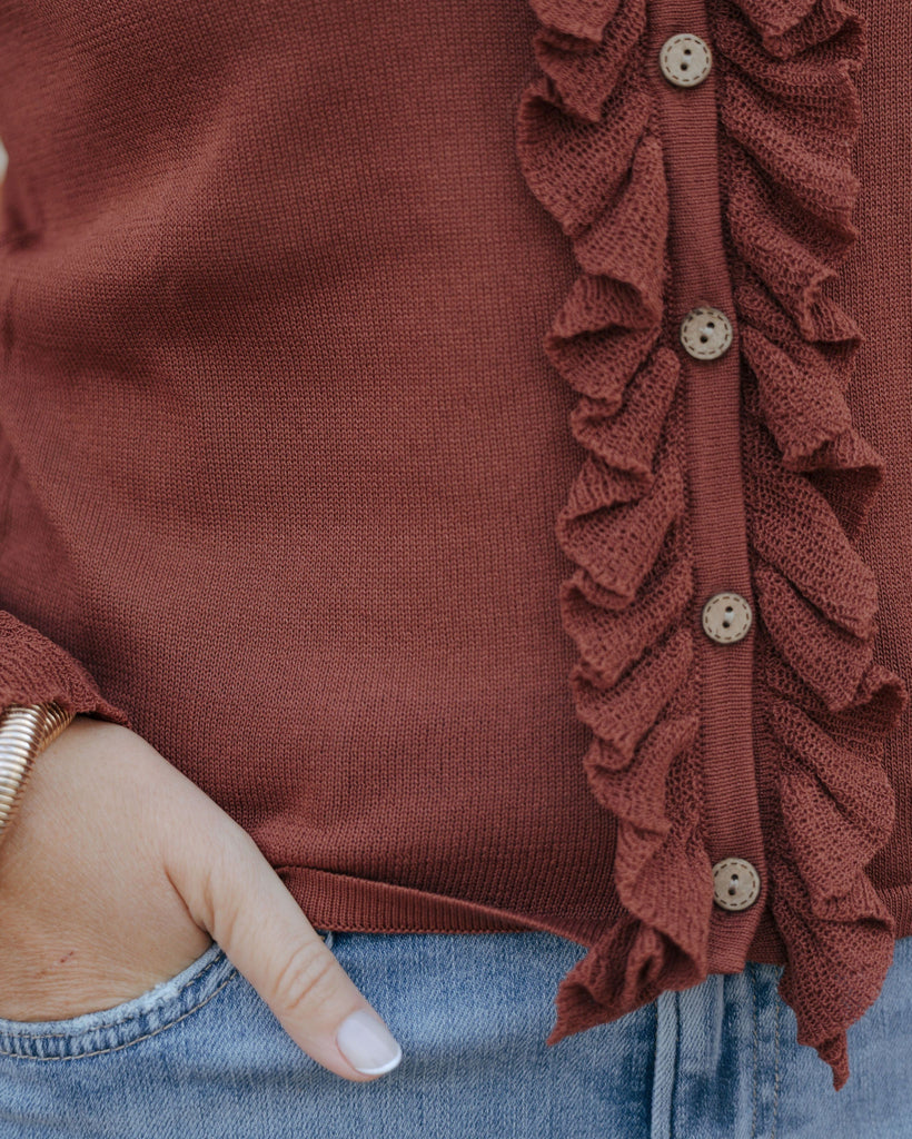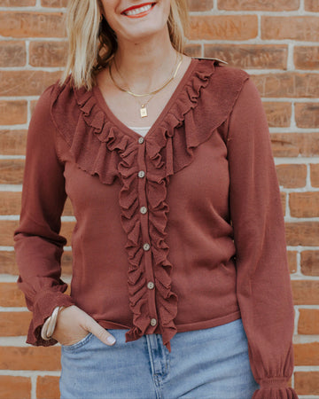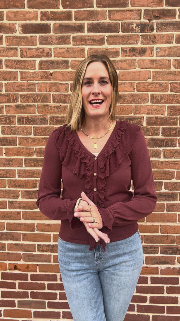 Add a flirty touch to your wardrobe with the Mulled Wine Blouse. Its playful ruffle contrast and charming button-front design bring a fun, feminine vibe. The button-down style and elastic wrists offer easy movement and a cozy fit, all wrapped in a rich maroon hue perfect for any occasion.