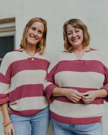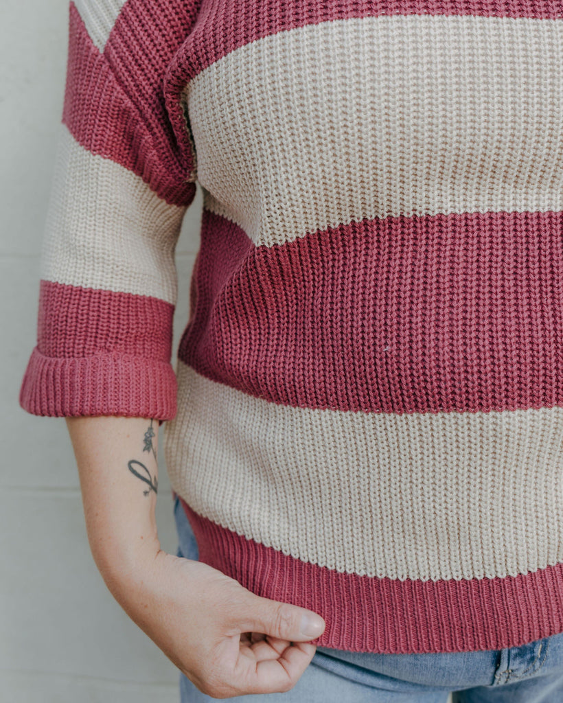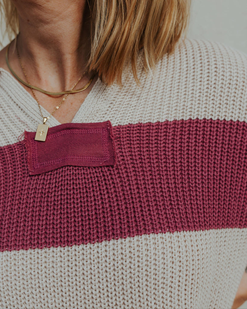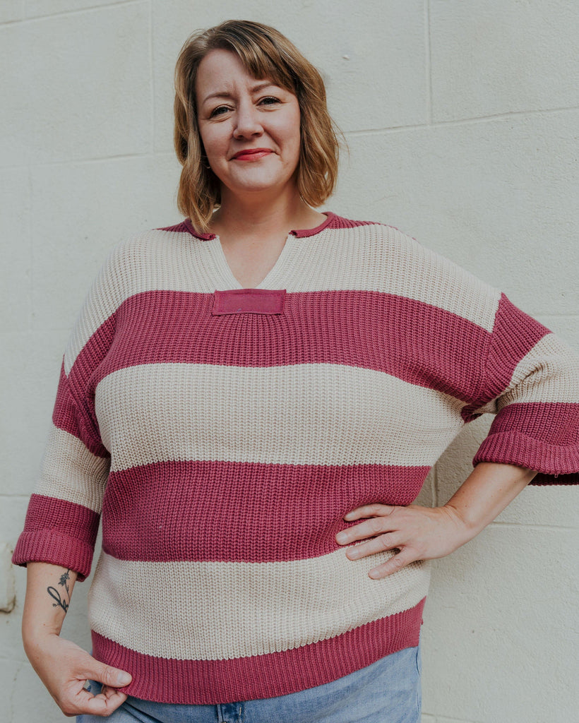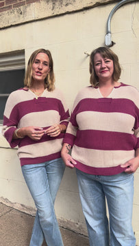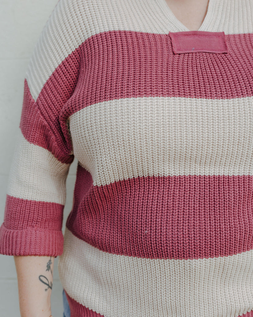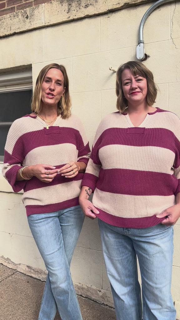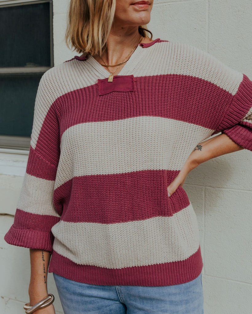 Step into cozy charm with the Last One To Know Top. This playful v-neck sweater features bold stripes and a soft knit fabric that wraps you in warmth and style. Perfect for layering on cooler days, its comfy fit makes it your go-to for casual fun and everyday adventures.
