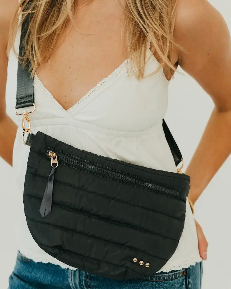 A trendy take on the updated fanny pack that can be worn in multiple ways. Wear it as a belt bag/fanny pack, crossbody, or shoulder bag. Comes in 3 colors and features a fun half moon shape with a coordinating shiny canvas strap and gold hardware and a pop of color with ribbon accent. We are obsessed with this style and the front zipper for easy access.