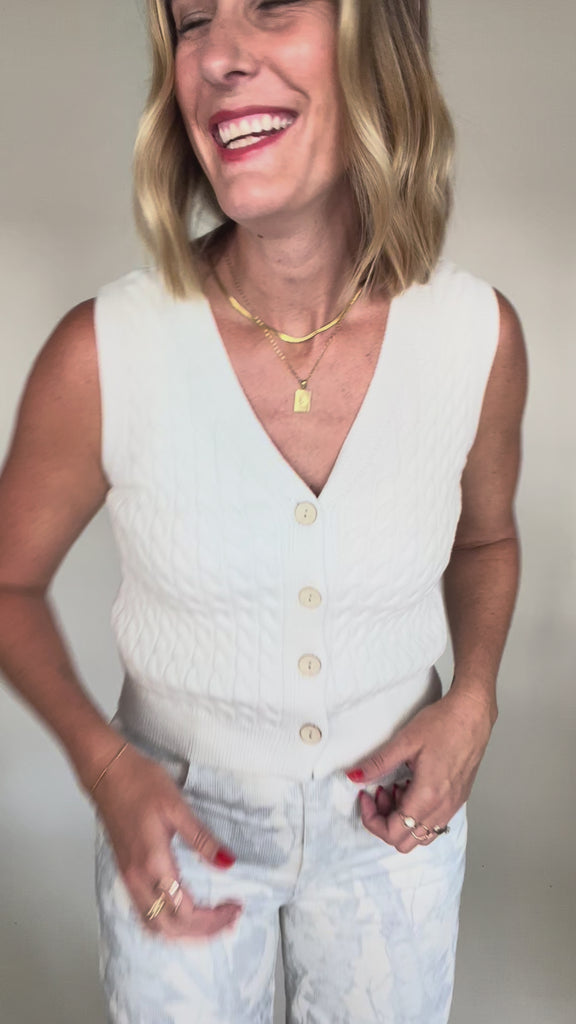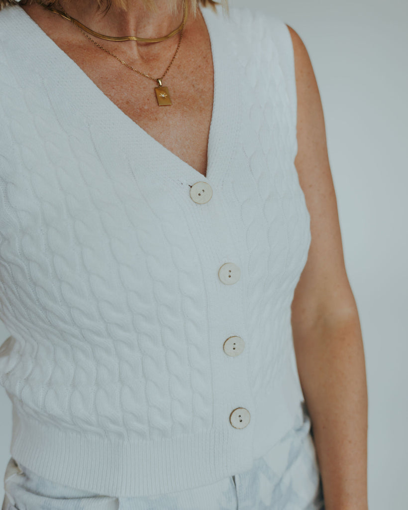 Cozy meets cool in the Frosted Vine Vest! This soft cable knit piece features a flattering v-neck that’s perfect for layering or wearing solo. Trendy and comfortable, it’s your new go-to for effortlessly chic style with a playful twist.