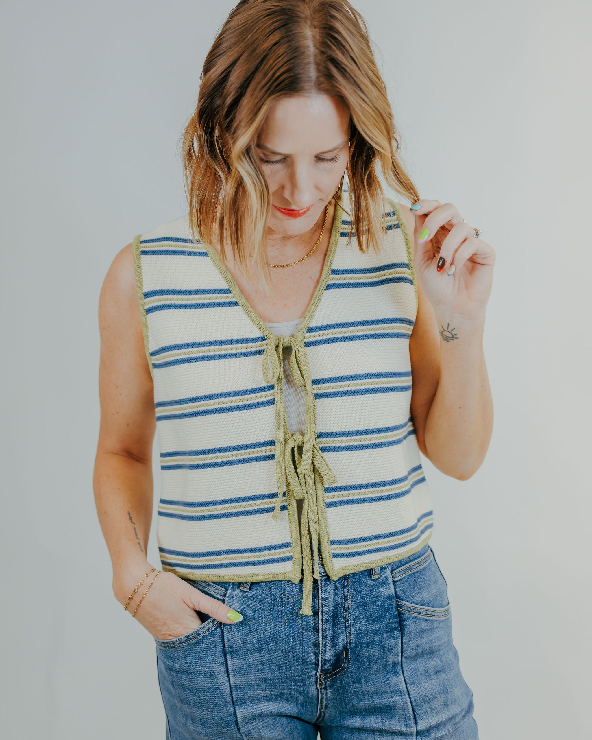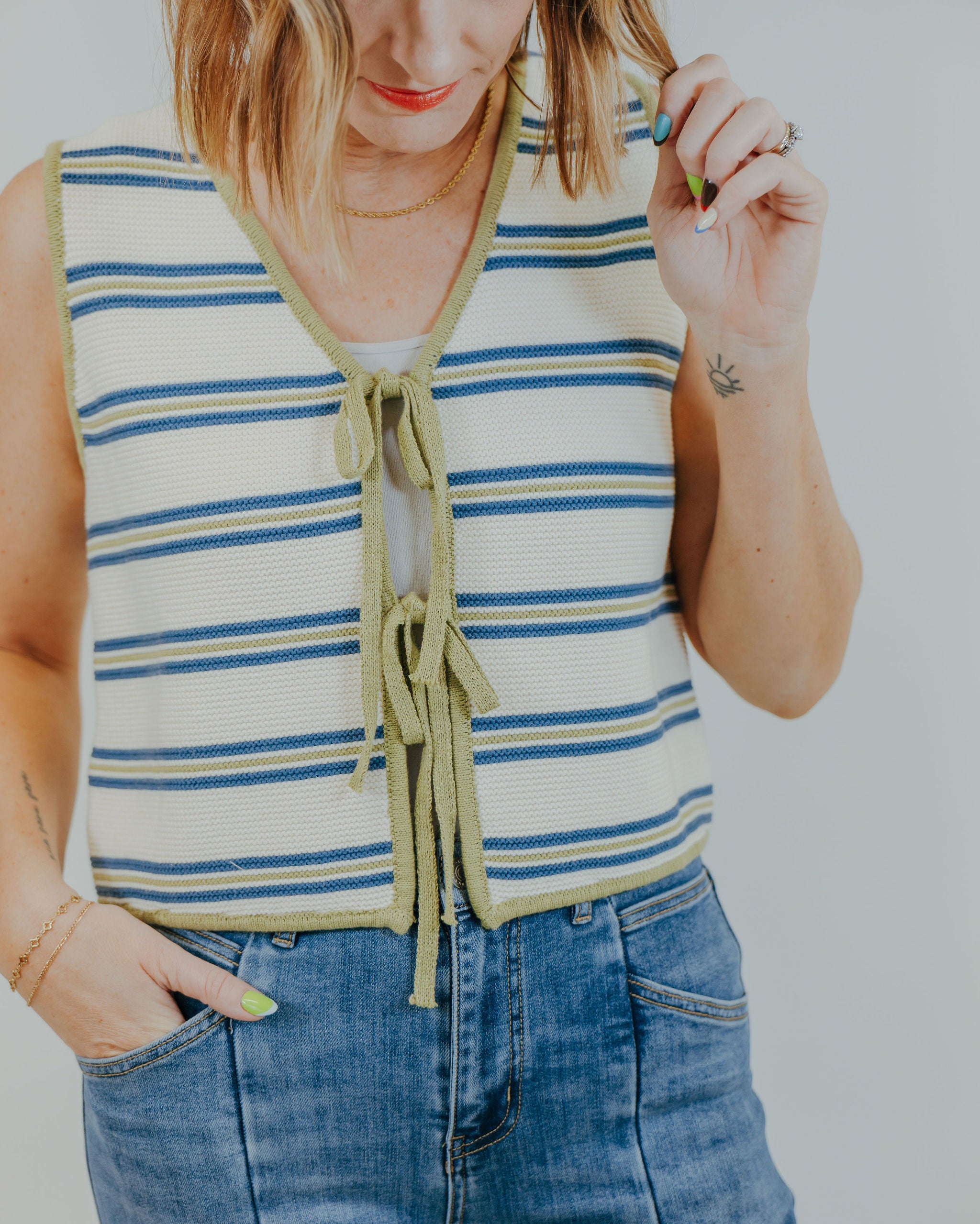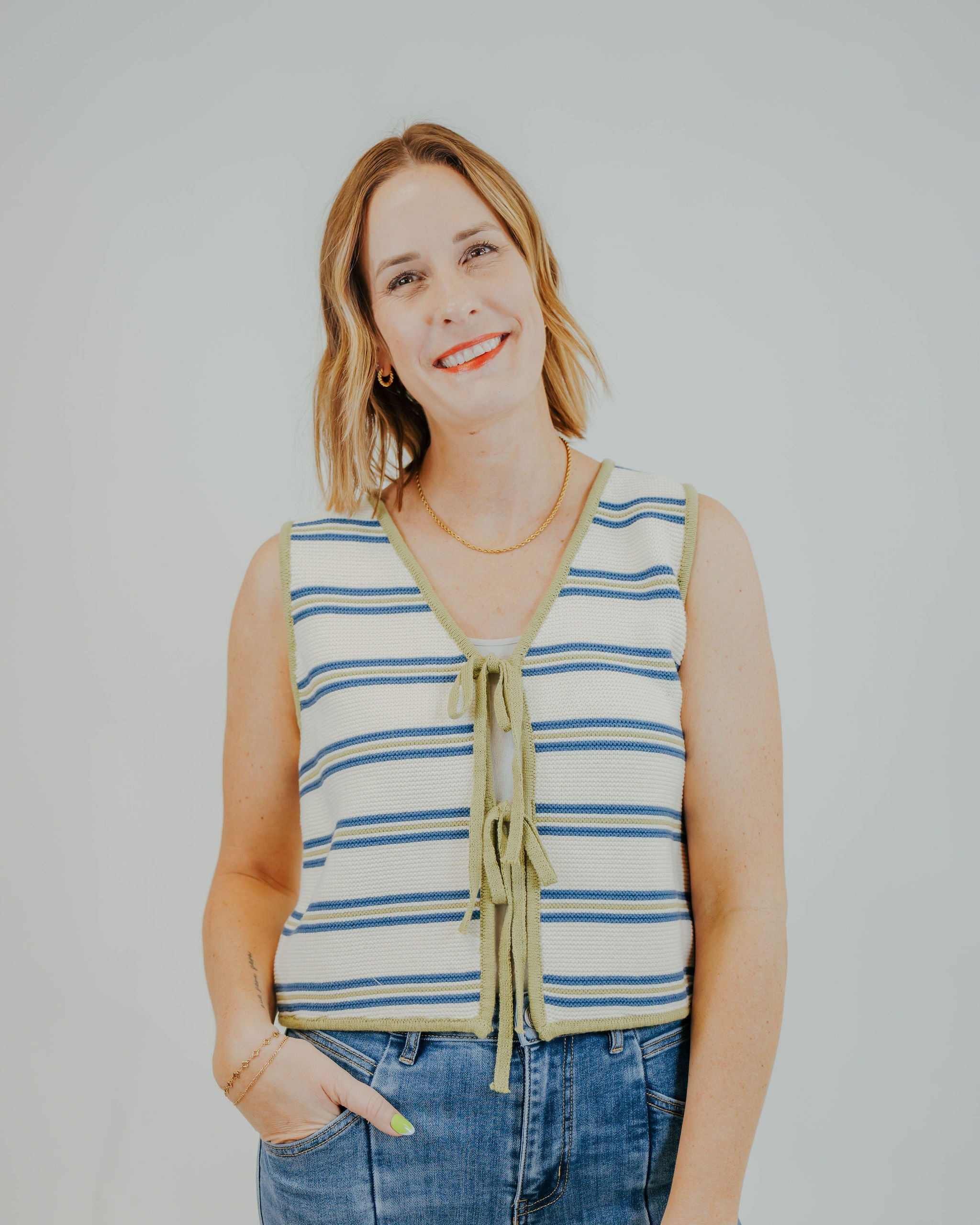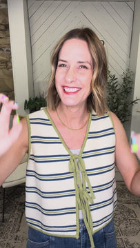 Layer this adorable striped knit vest over your favorite tee or dress for instant style. The charming tie-front detail adds a playful twist that's perfect for mixing and matching. Lightweight and versatile, it's your go-to piece for creating effortless, put-together looks all season long.