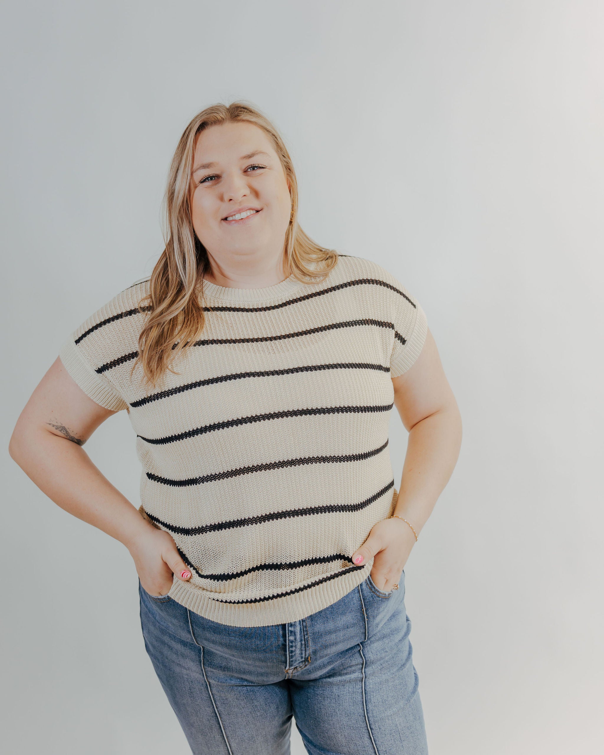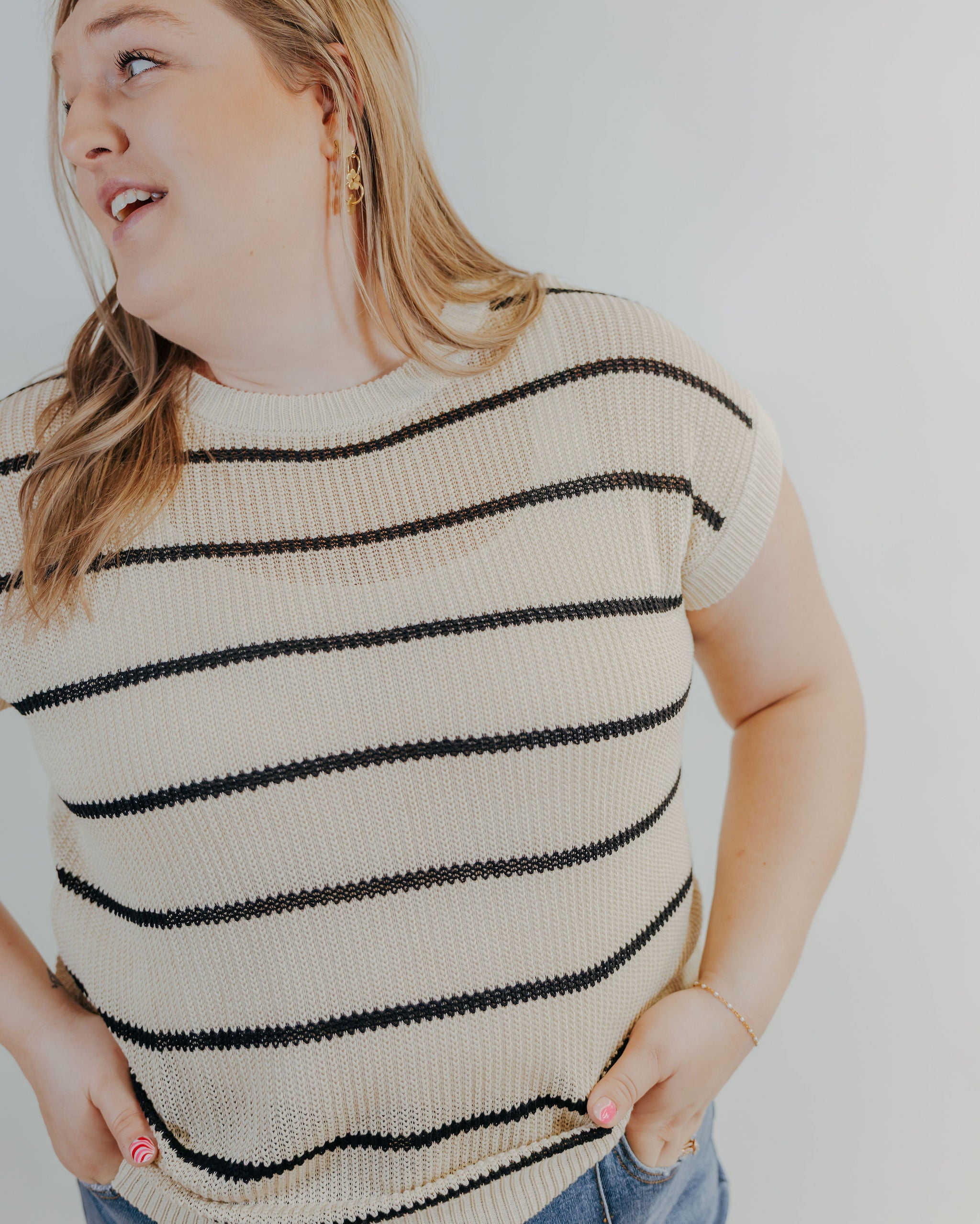 The Barefoot Bay Top is an elevated classic you’ll reach for again and again. This lightweight knit short sleeve top features a rich mocha base with sleek black stripes for a timeless, polished look. Designed for comfort without sacrificing style, it offers an easy, flattering fit that works year-round. Perfect for dressing up with trousers or keeping it casual with denim, this striped knit top is a versatile staple that adds effortless sophistication to any outfit.
