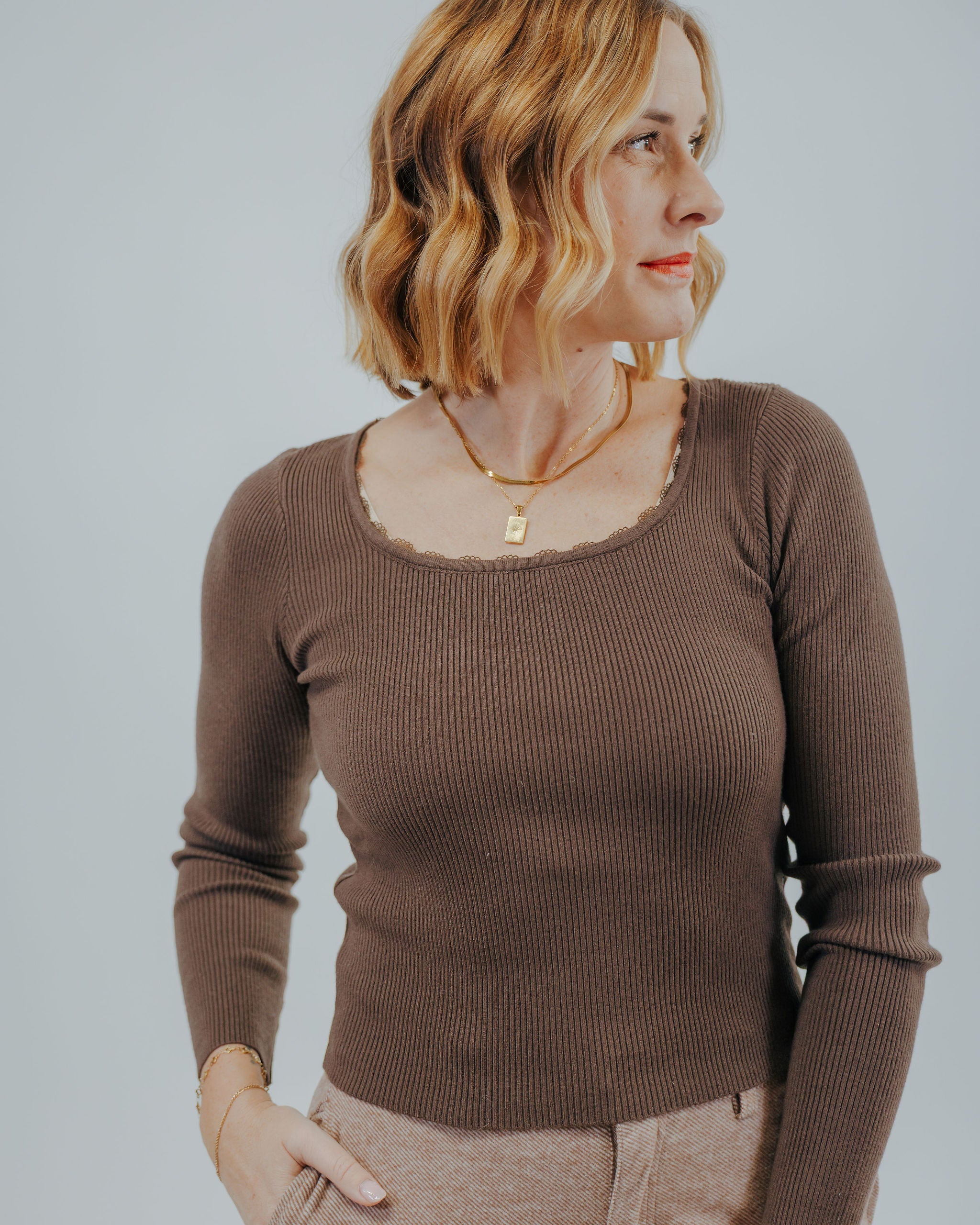 The wardrobe essential you didn't know you needed—a lightly ribbed long sleeve with delicate lace trim that elevates the everyday basic. The subtle ribbed texture hugs just right without clinging, while the feminine lace detailing at the cuffs or hem adds a touch of understated elegance. Versatile enough to pair with anything in your closet, this piece works as a standalone top or the perfect layering piece. Simple, sweet, and endlessly wearable.