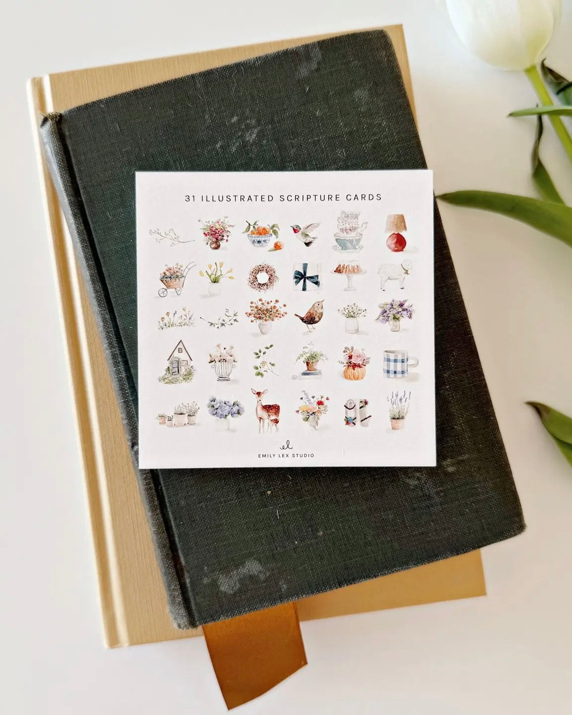 31 beloved Psalms paired with watercolor illustrations make for a lovely encouragement of beauty and truth. Display in your home for a pretty way to point to Jesus. Use them as daily or weekly memory verse reminders. Share them as encouragement with a friend. Easily used as gift tags, bookmarks, tiny notes, and more! Details: - 31 card set - 4" x 4" square - 120lb cotton eggshell textured paper