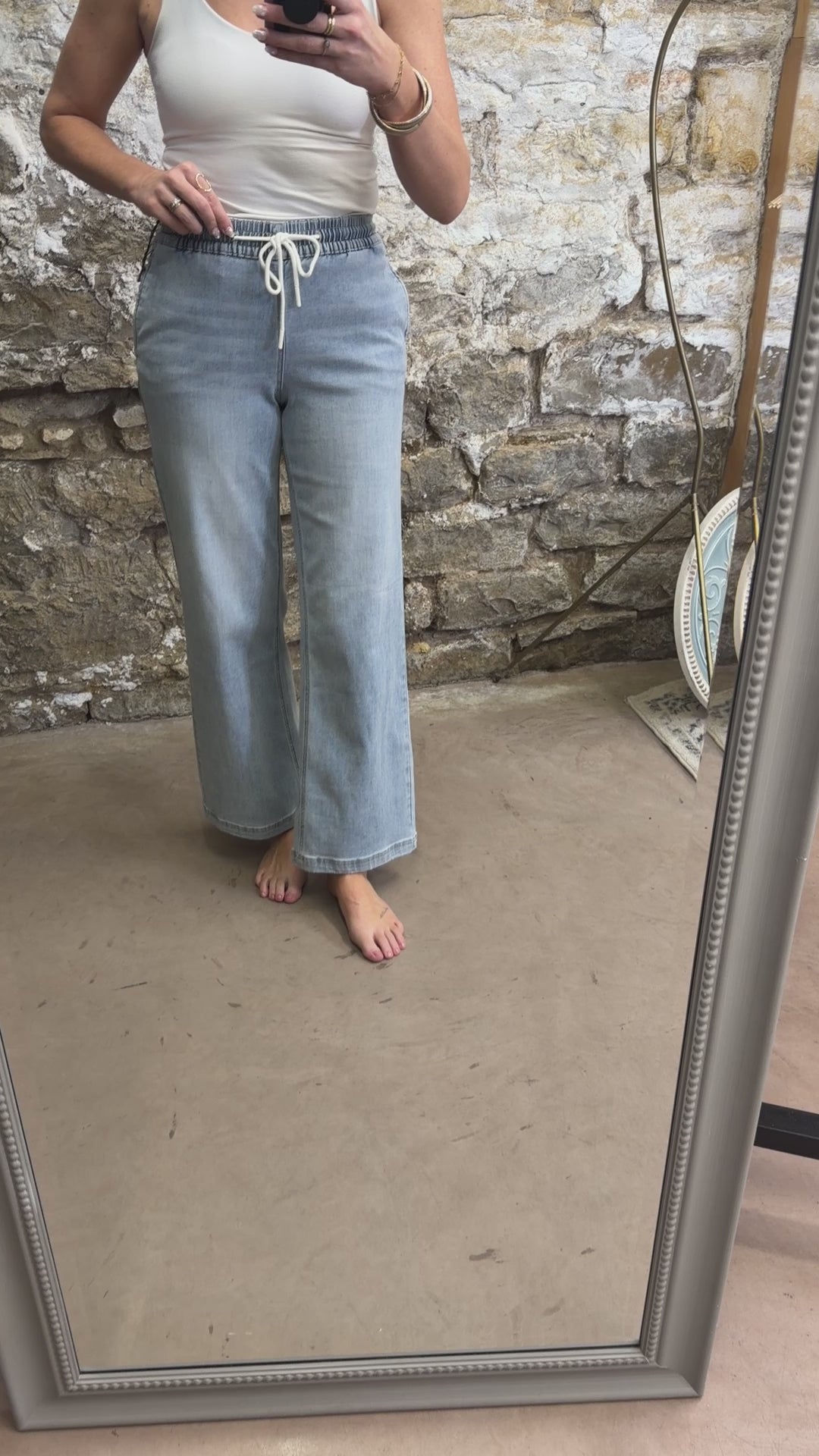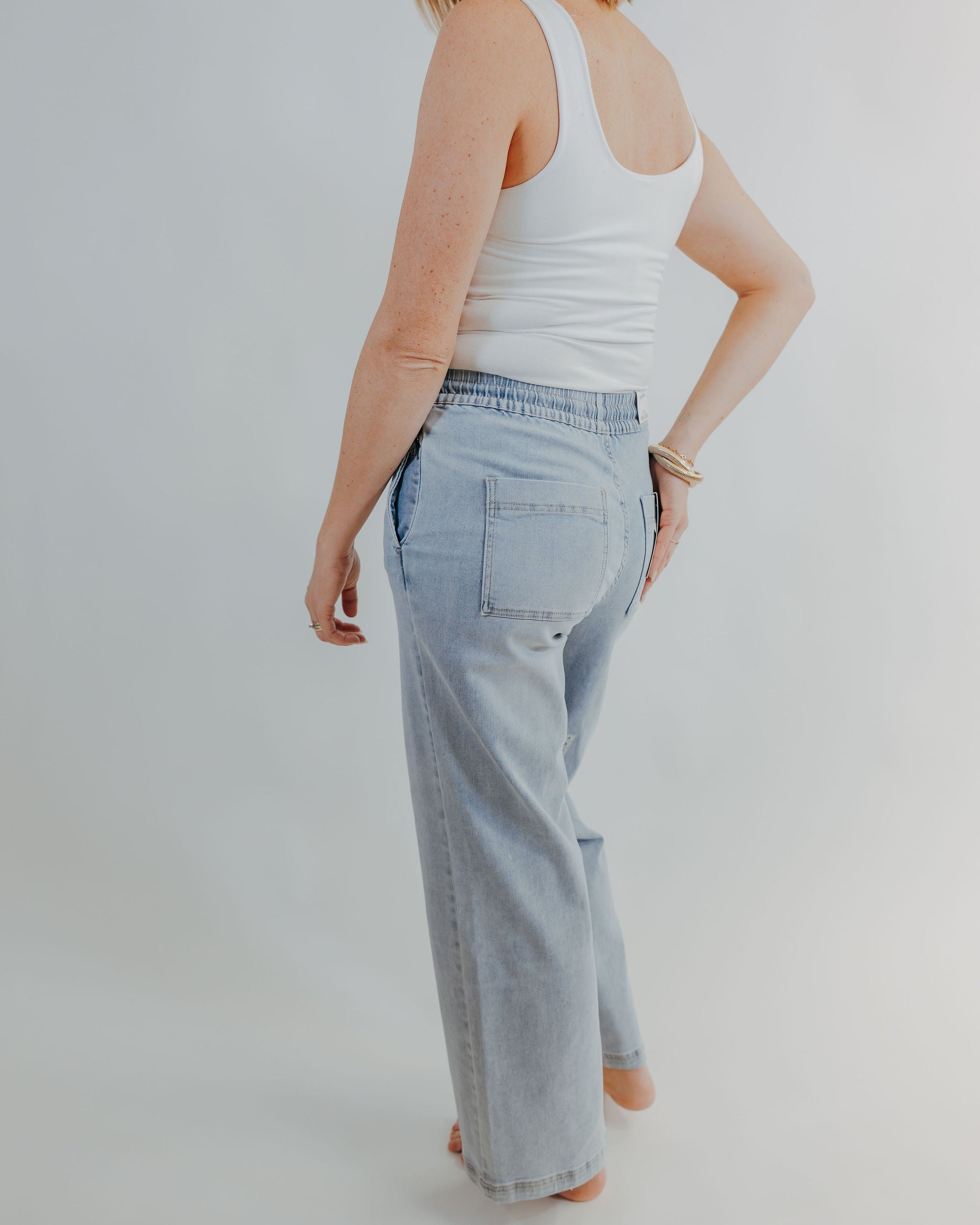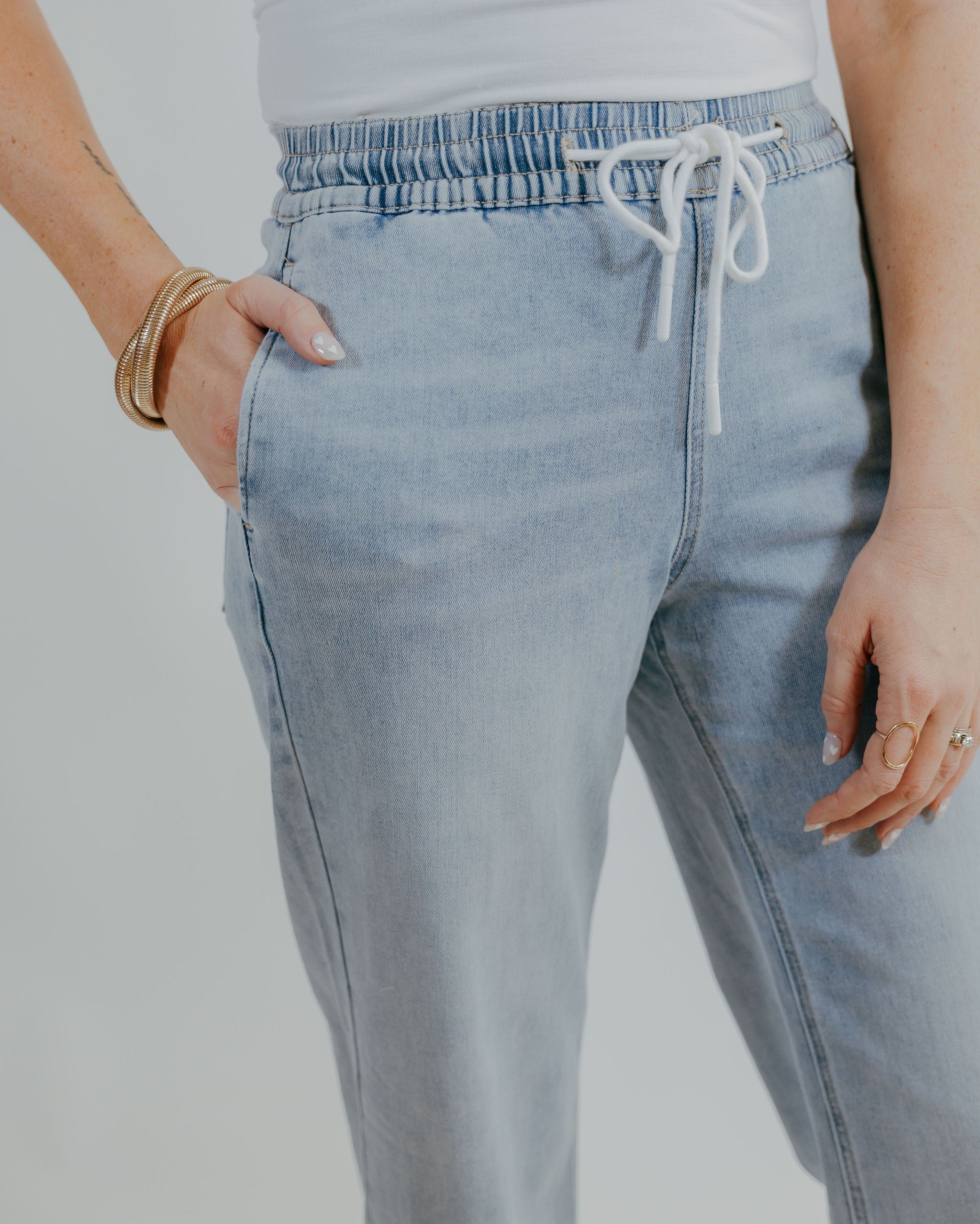 Slip into effortless style with these high-rise wide-leg joggers—the perfect blend of cozy comfort and casual cool. Featuring a lighter wash denim that feels fresh and approachable, they're designed with a drawstring waist for that customizable fit you'll love. Whether you're running errands or settling in for the day, these joggers deliver the softness and ease that makes getting dressed actually fun. A wardrobe essential that proves comfort never goes out of style.