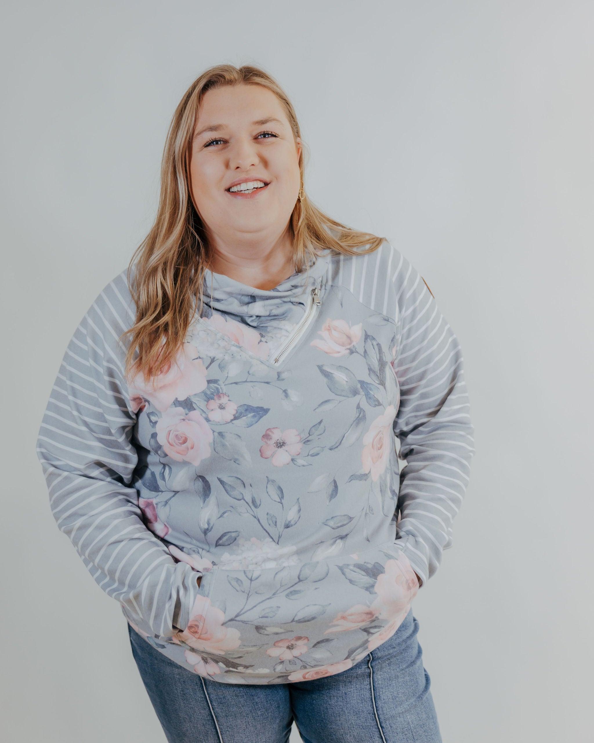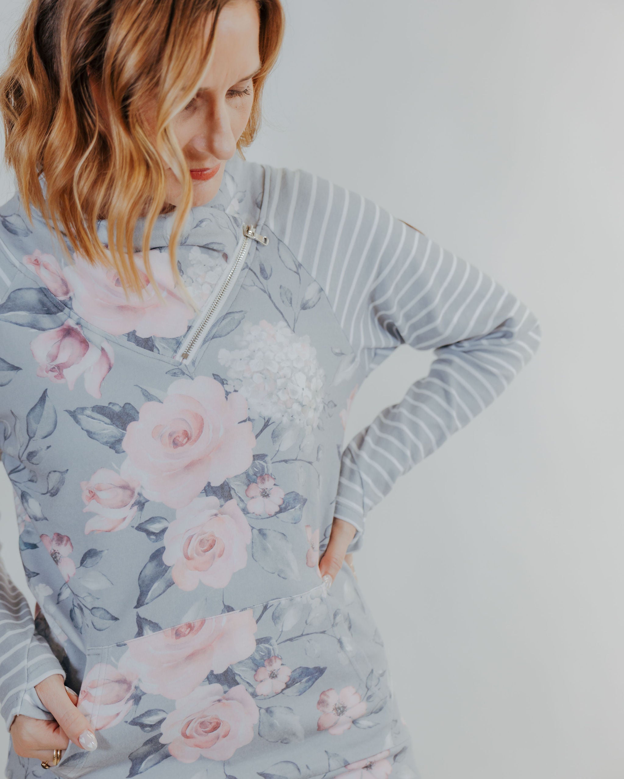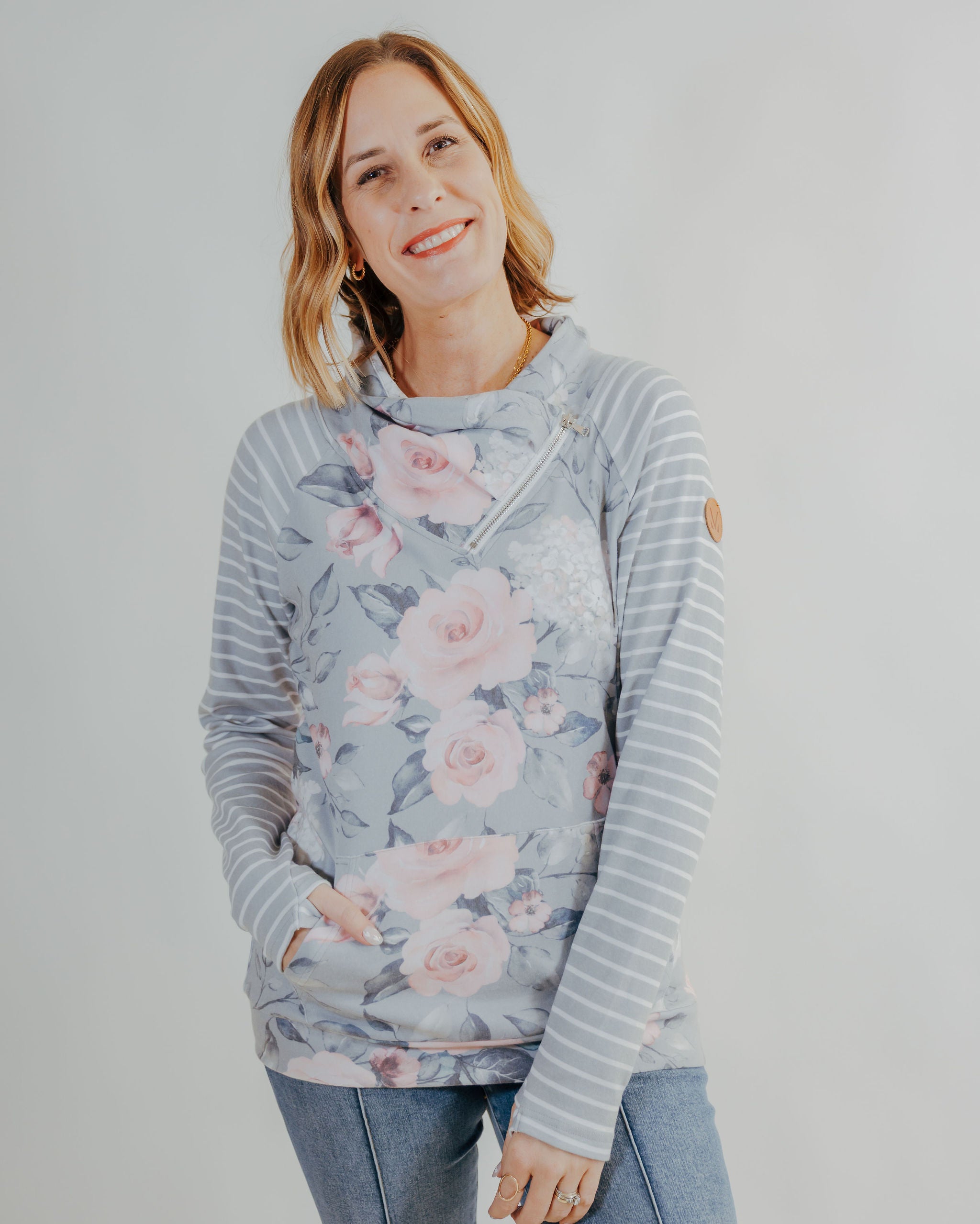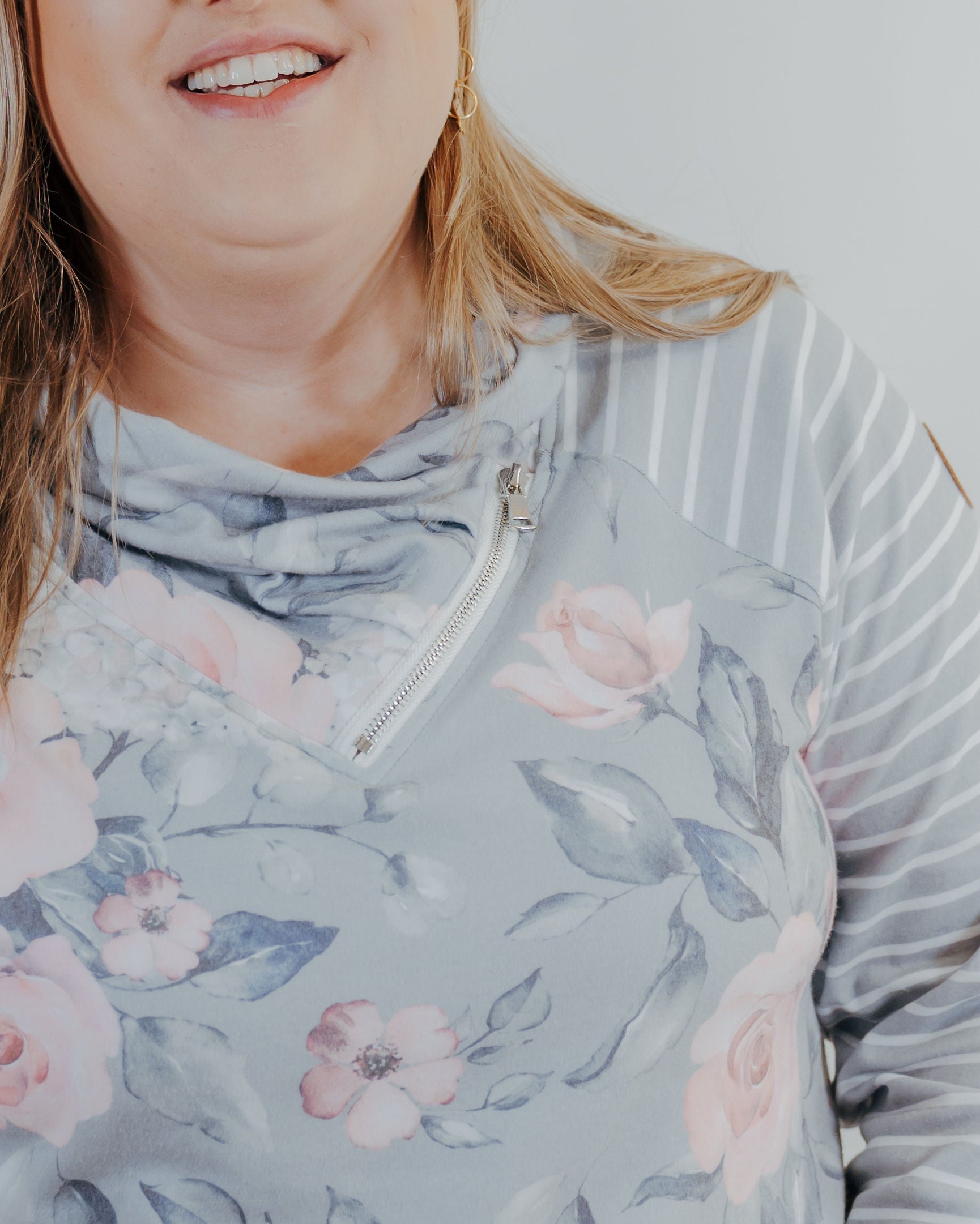 Zoey Zipcowl Sweatshirt - Grey Floral & Stripes