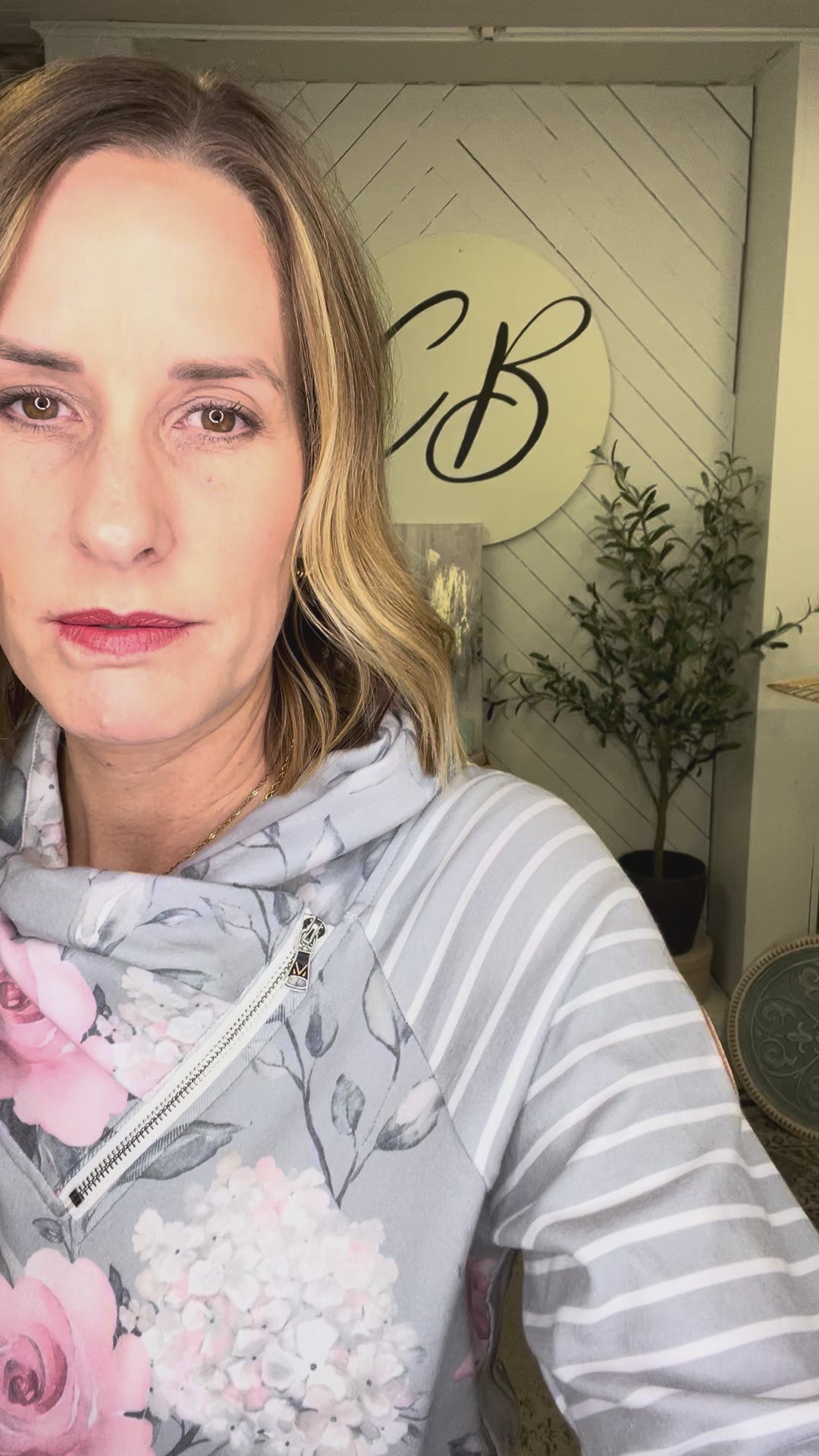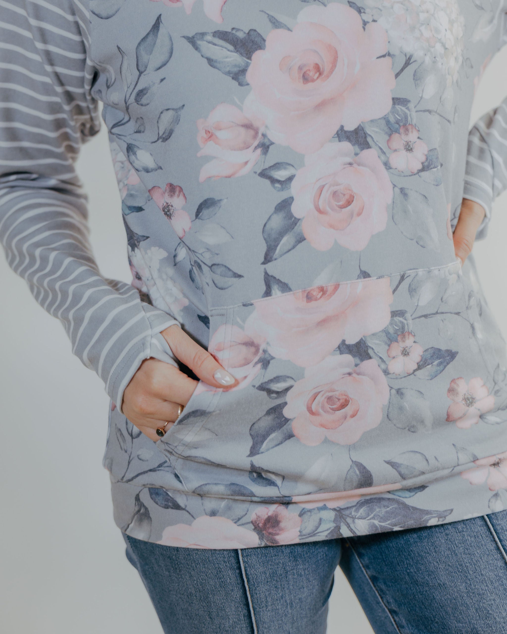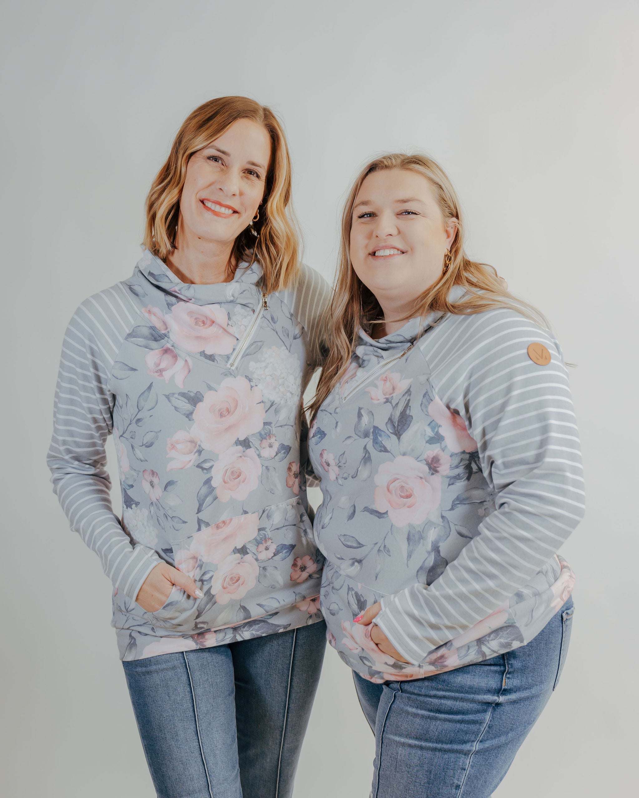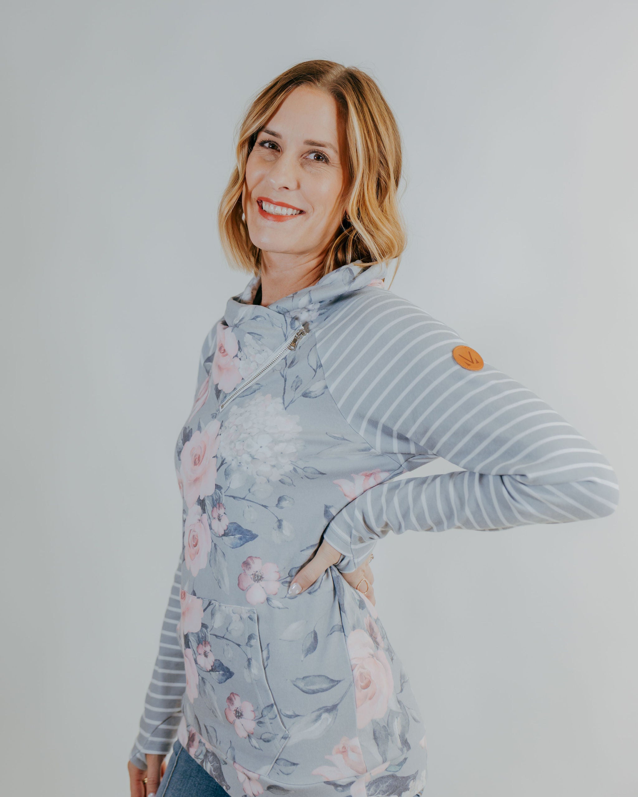 Zoey Zipcowl Sweatshirt - Grey Floral & Stripes
