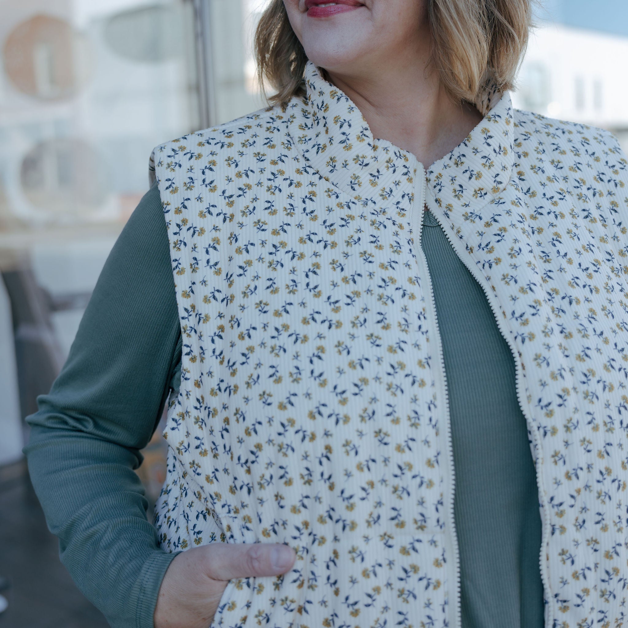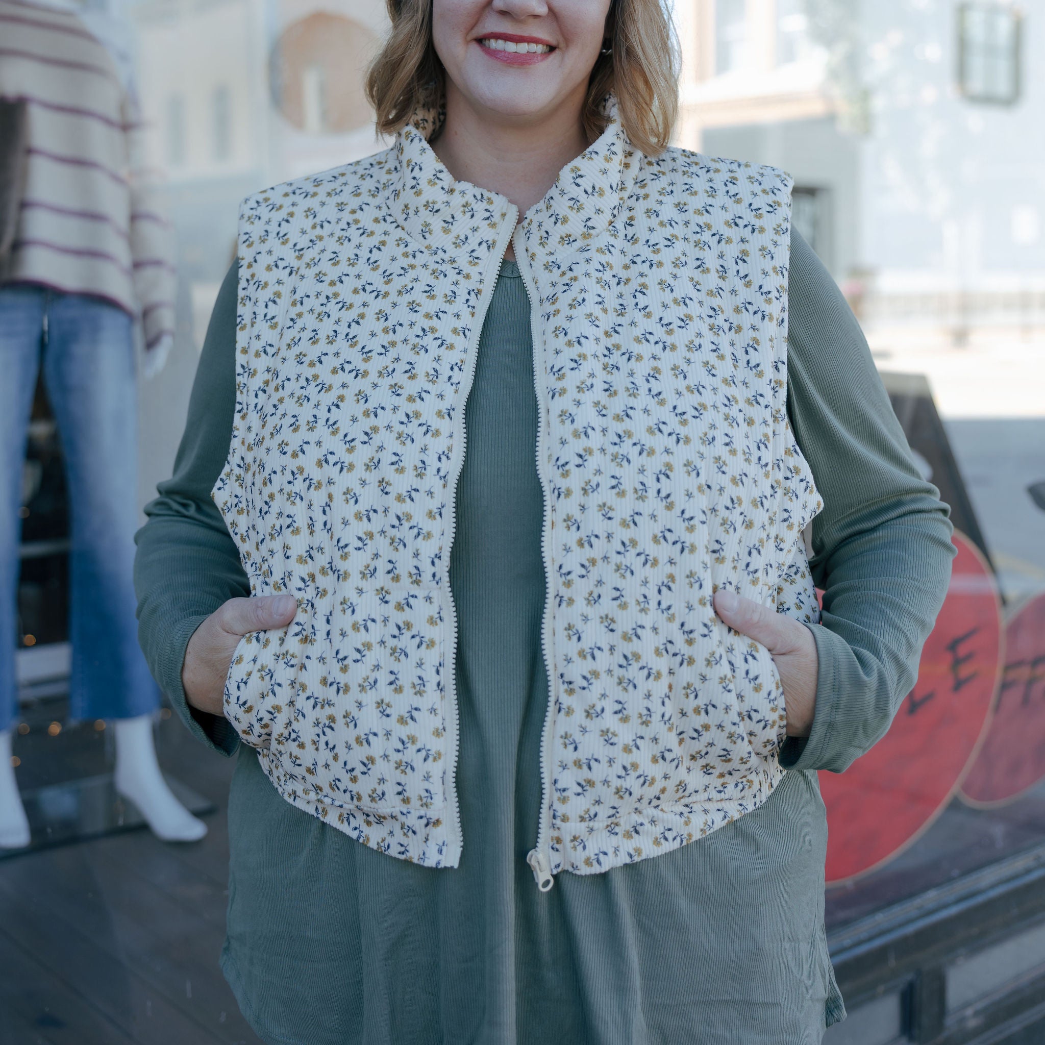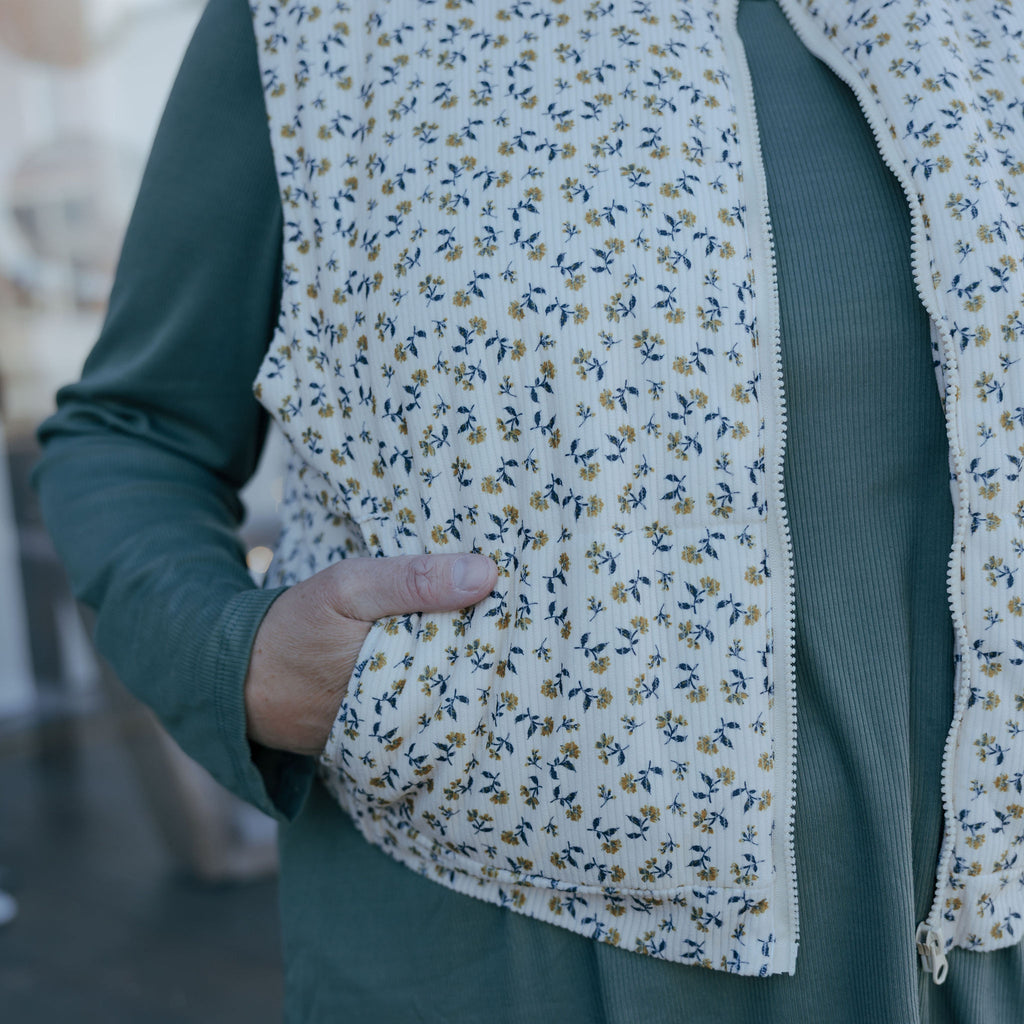 Add a pop of playful charm to your outfit with the Near Miss Vest. This sleeveless corduroy vest features a cream base adorned with a delightful floral print, perfect for brightening up any look. Practical pockets and a smooth zip closure keep essentials close while adding style. Light, cozy, and fun, it’s the perfect layering piece to turn heads on any casual day.