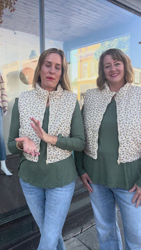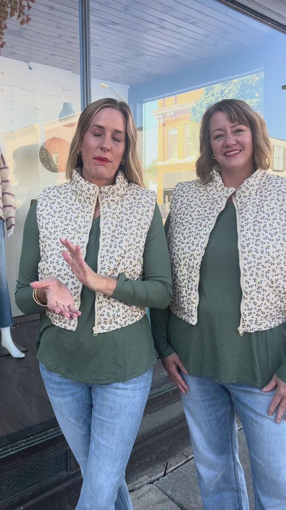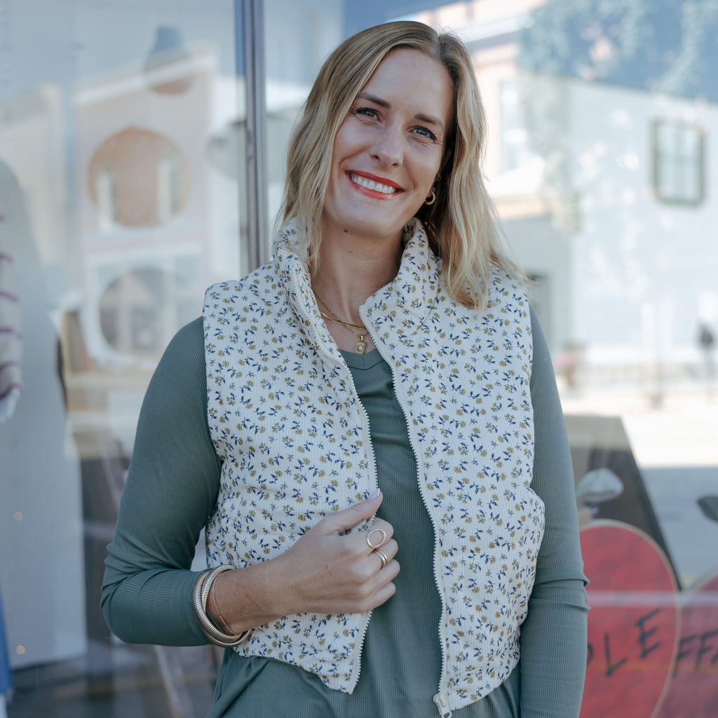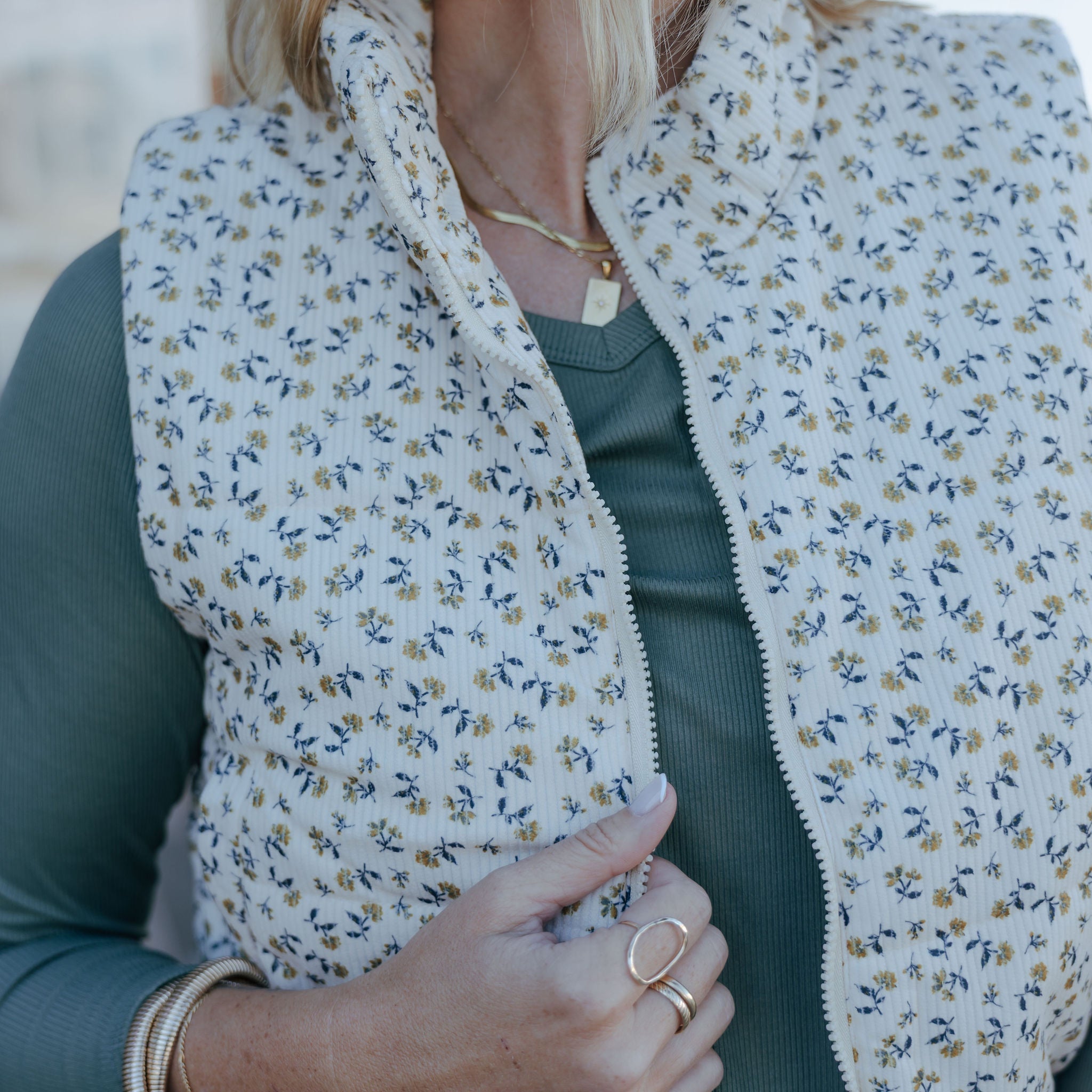 Add a pop of playful charm to your outfit with the Near Miss Vest. This sleeveless corduroy vest features a cream base adorned with a delightful floral print, perfect for brightening up any look. Practical pockets and a smooth zip closure keep essentials close while adding style. Light, cozy, and fun, it’s the perfect layering piece to turn heads on any casual day.