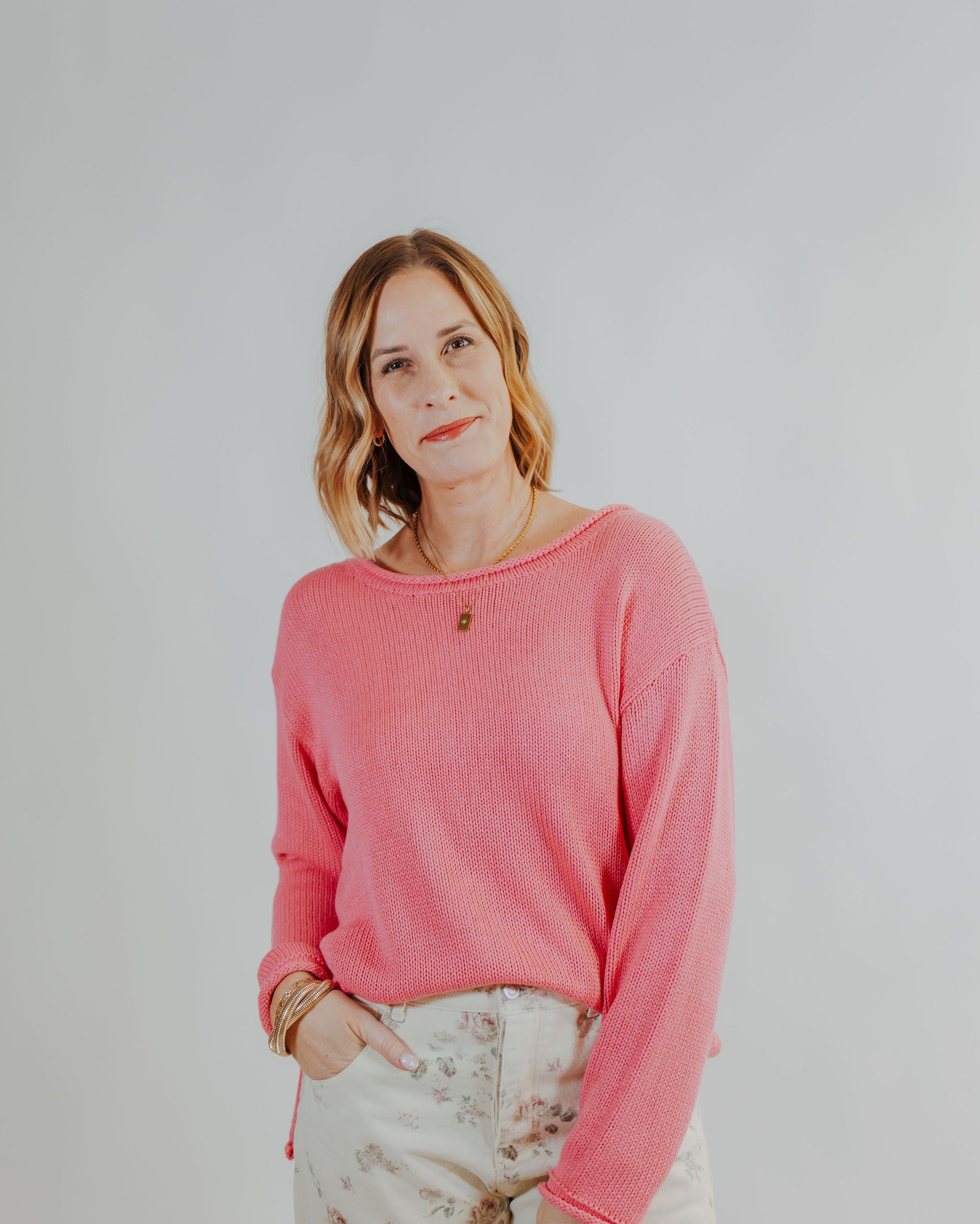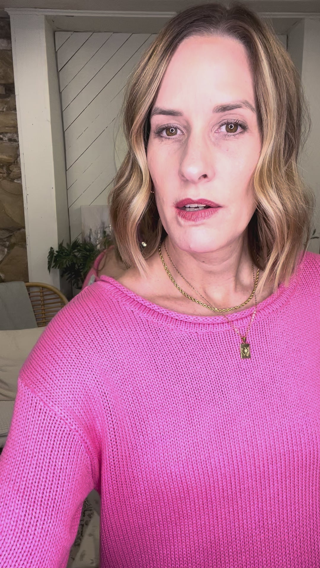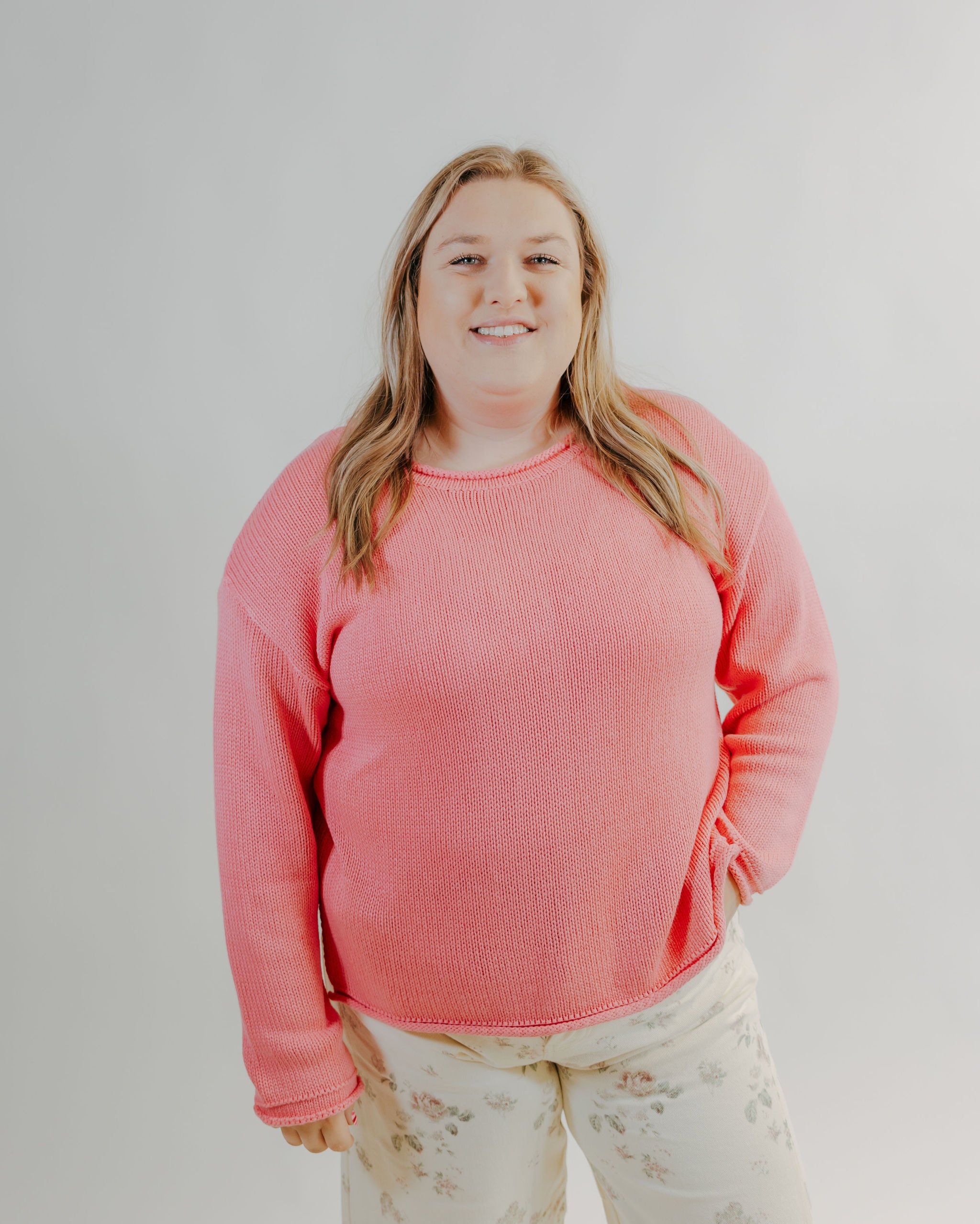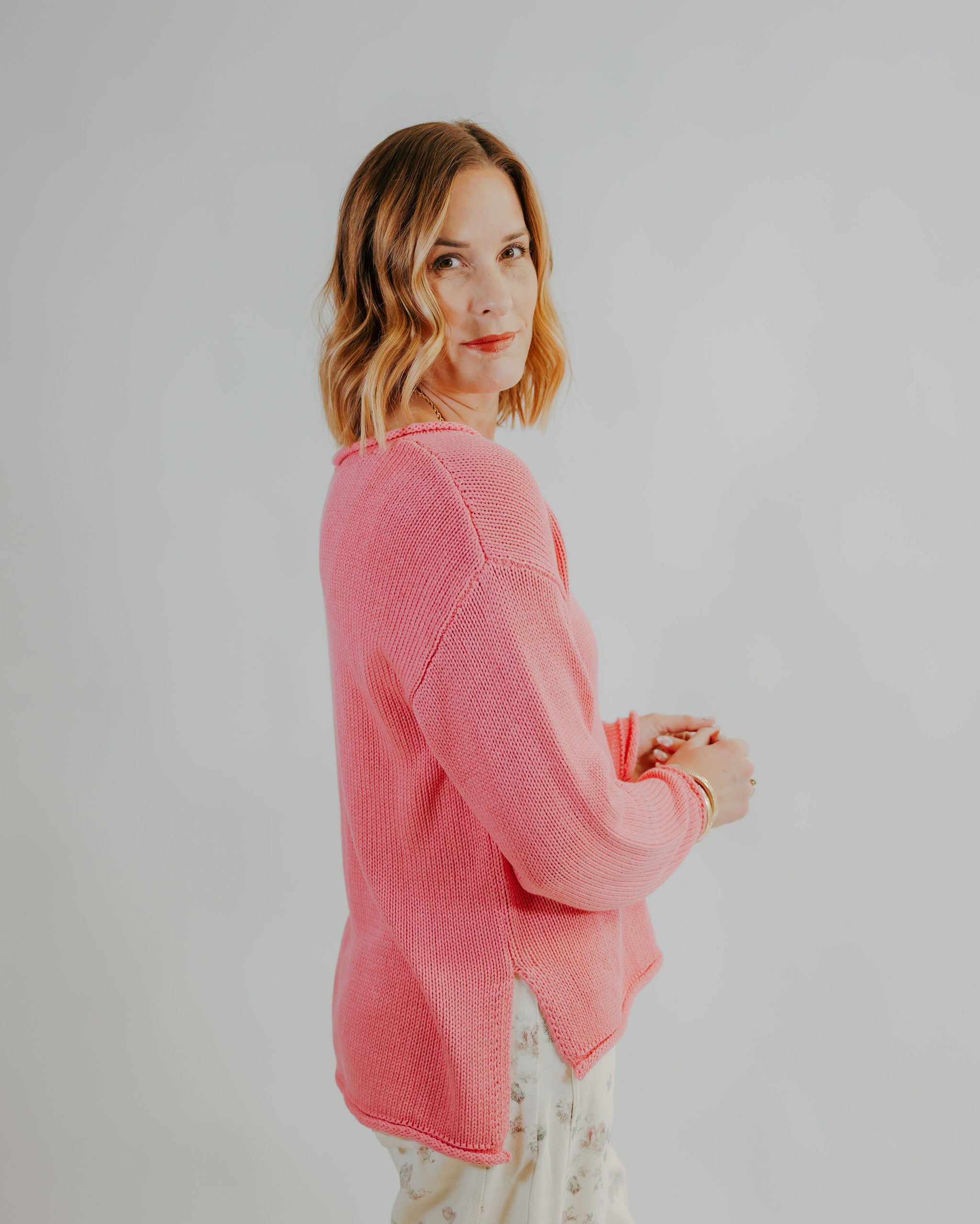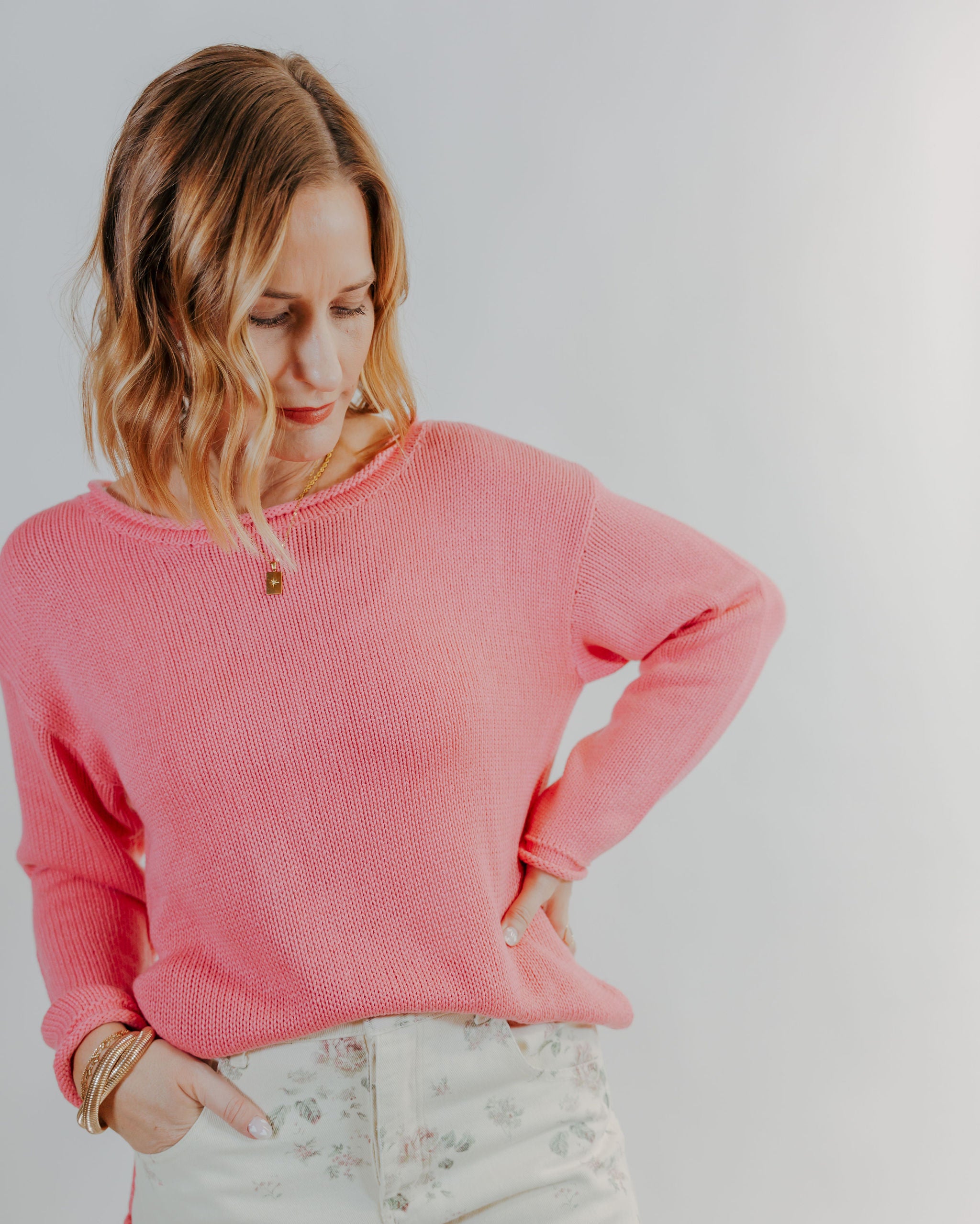 Introducing the Flamingle Lightweight Sweater in bold pink—your new go-to for effortless style. This long sleeve knit top features a classic round neckline with a charming rolled hem detail, paired with a relaxed fit that moves with you. Crafted from lightweight knit fabric, it's perfect for layering or wearing solo. Cozy meets cool in this versatile piece that works from casual coffee runs to weekend hangouts.