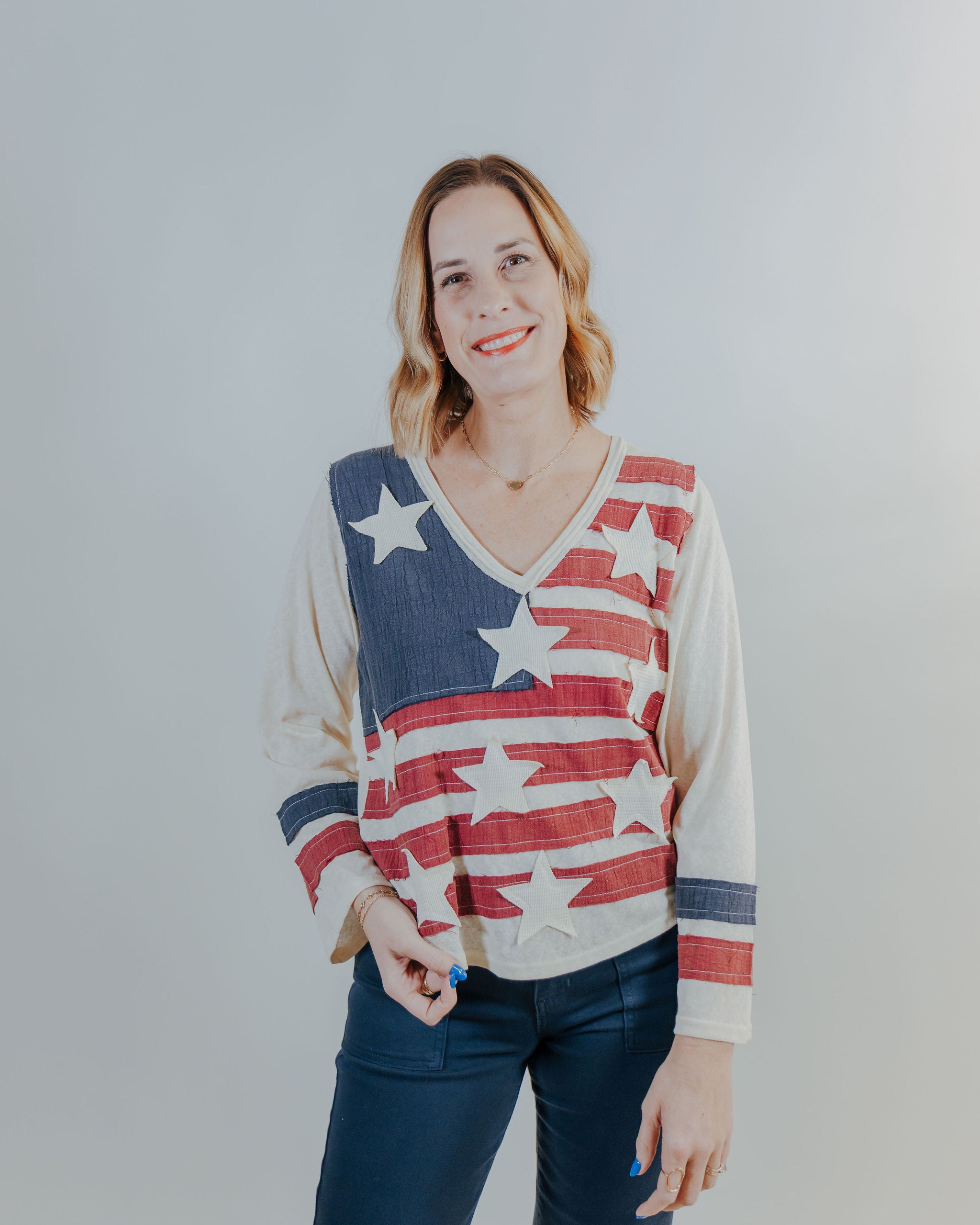 Show your patriotic side with a lighthearted flair. This long sleeve features an adorable take on classic American flag imagery—bold, cheerful, and unapologetically fun. Whether you're heading to a summer gathering, casual hangout, or just want to wear your heart on your sleeve, this tee delivers comfort and personality in one. A feel-good piece that celebrates the red, white, and blue with a wink and a smile.
