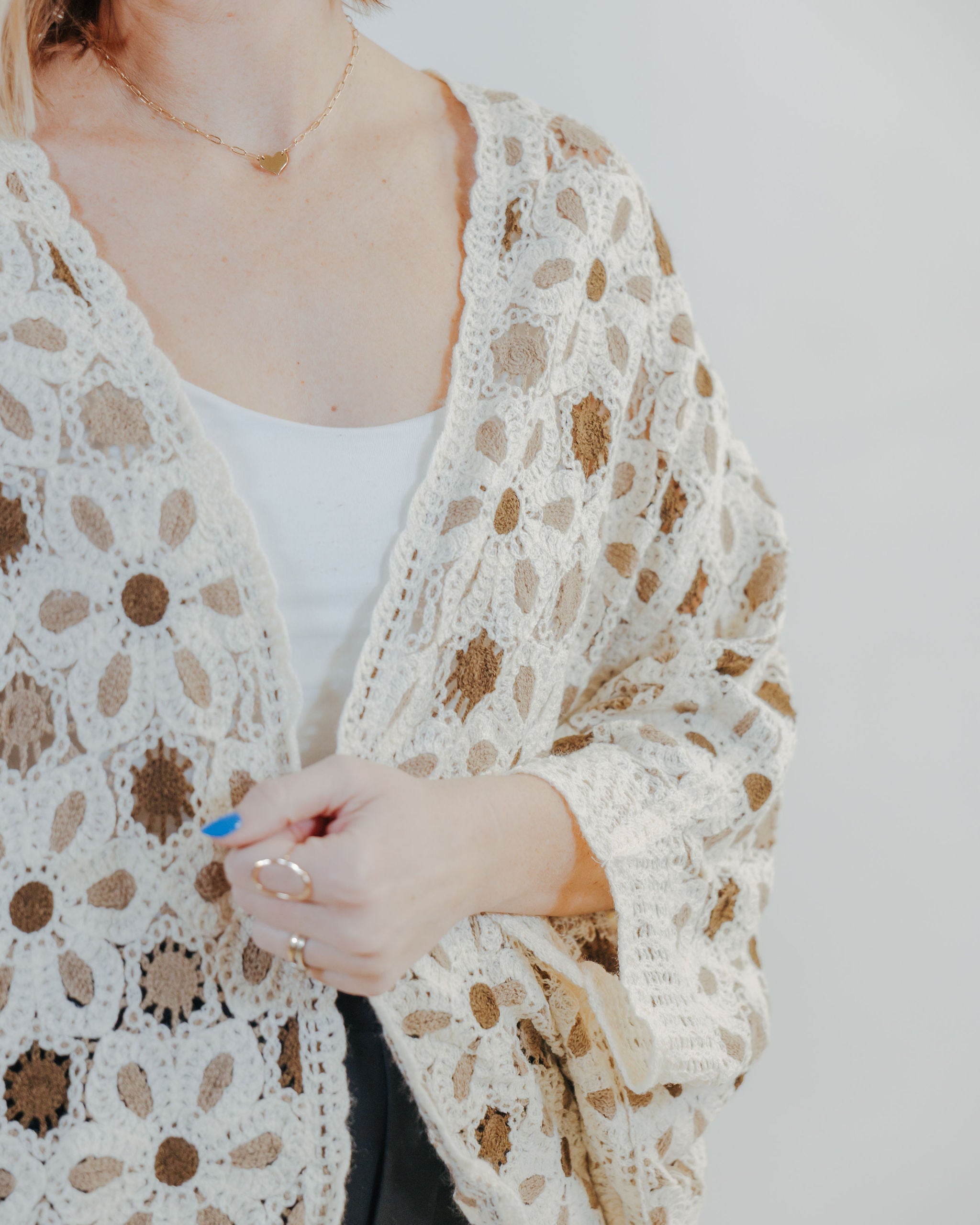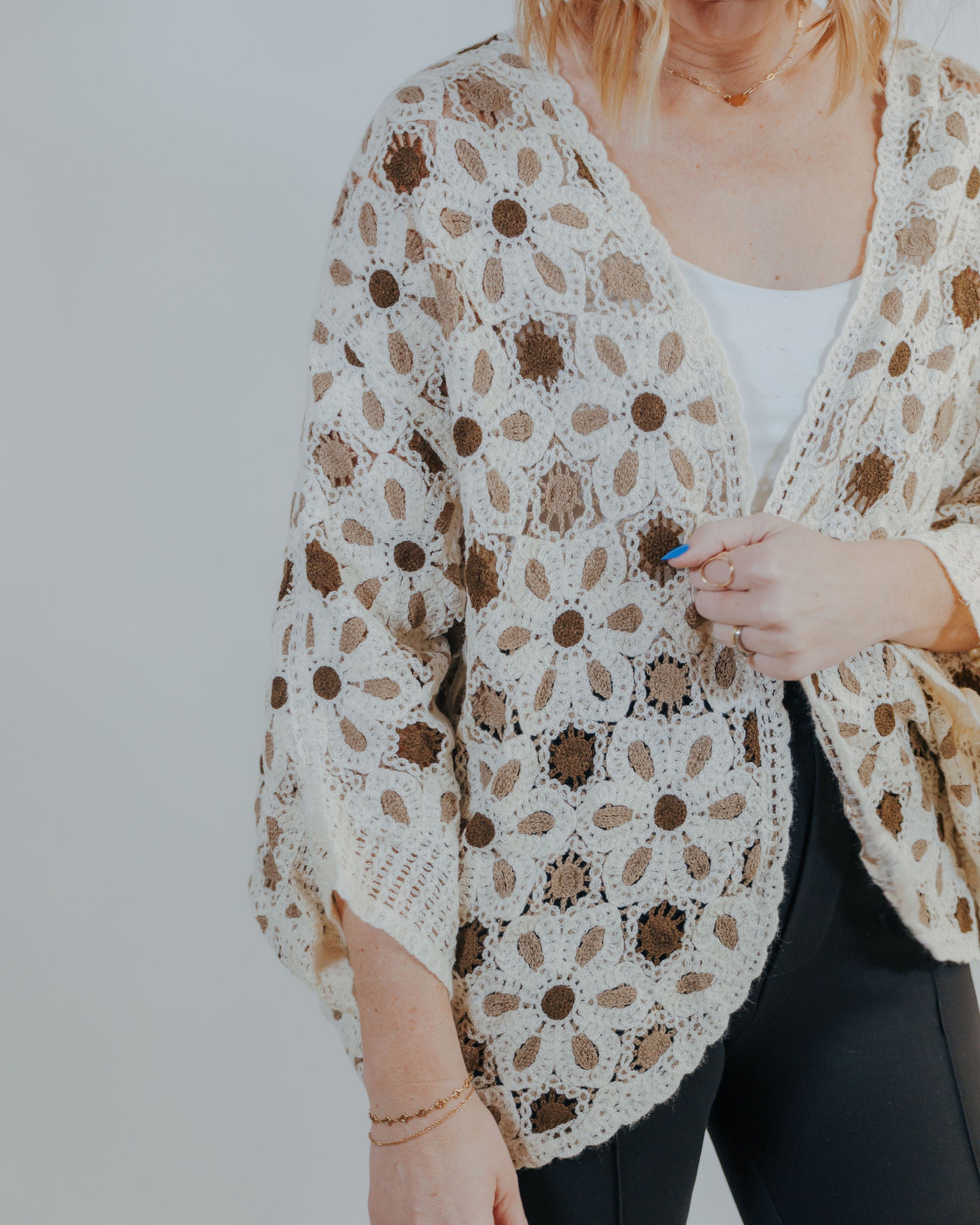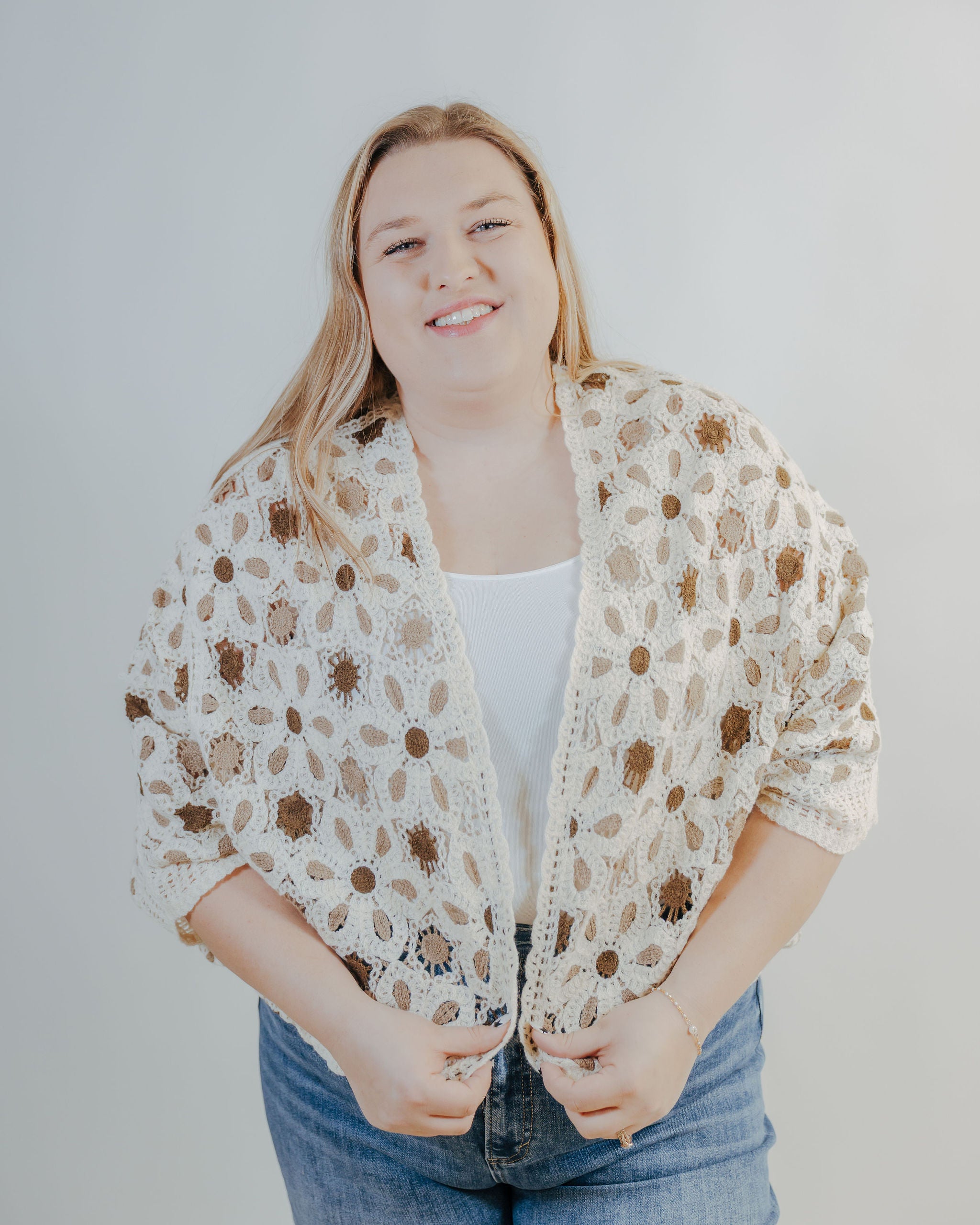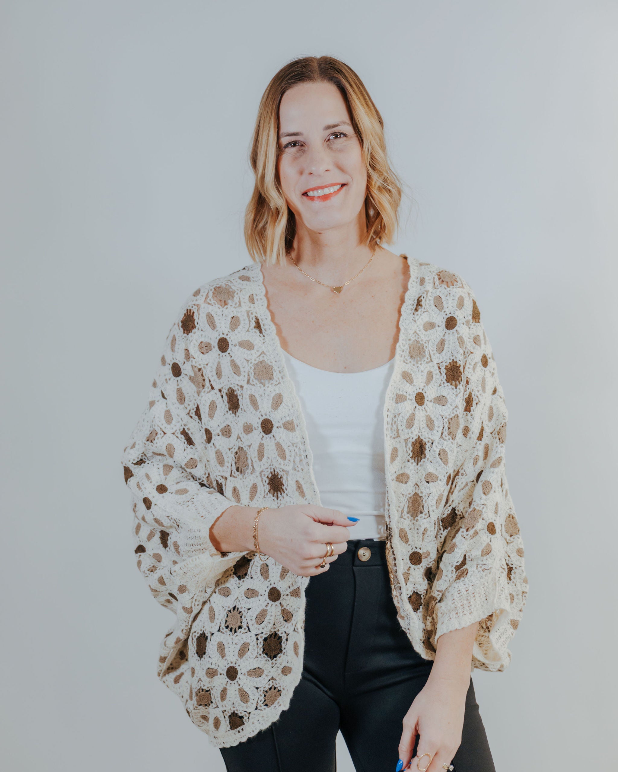 Layer it up with this charming knit cardigan, where delicate flower details add a whimsical touch to an everyday essential. Lightweight and perfectly versatile, it's ideal for transitional seasons or layering over your favorite tees. Cozy without the bulk—this is the cardigan you'll reach for again and again.