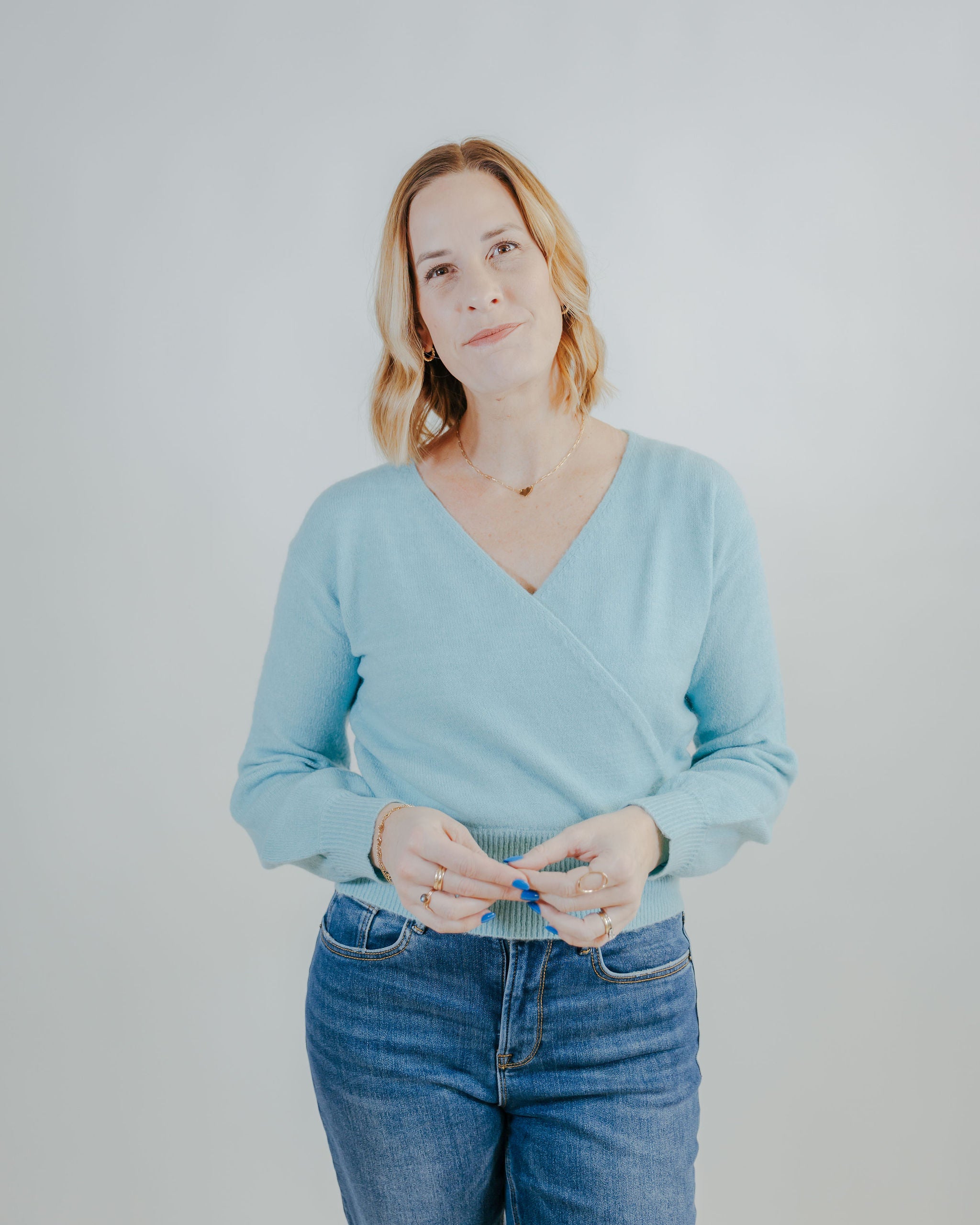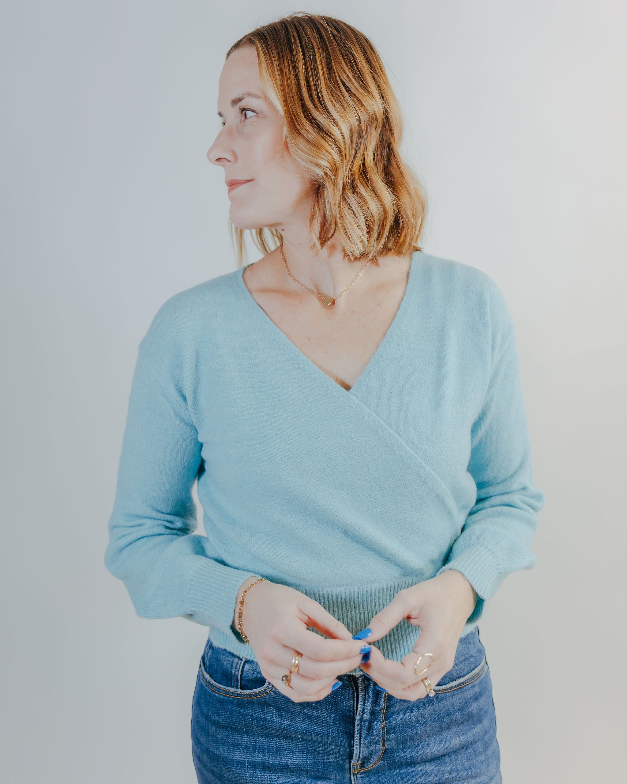 Step into cozy elegance with the September's End Sweater. This soft, classic knit features a flattering deep V-neck and a playful wrap front that adds a touch of charm to your everyday look. Perfect for layering or wearing solo, it’s your new go-to for effortless style with a twist.