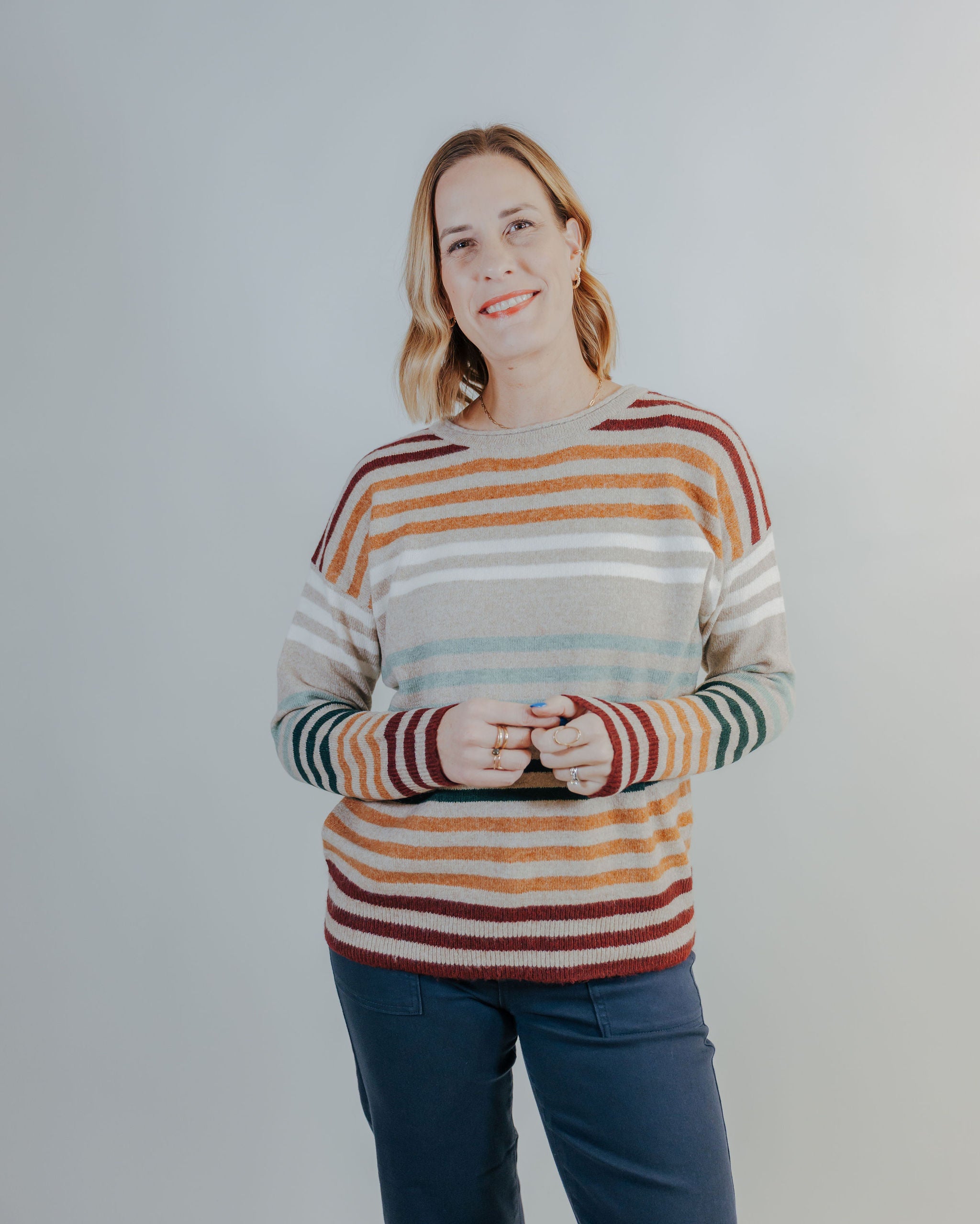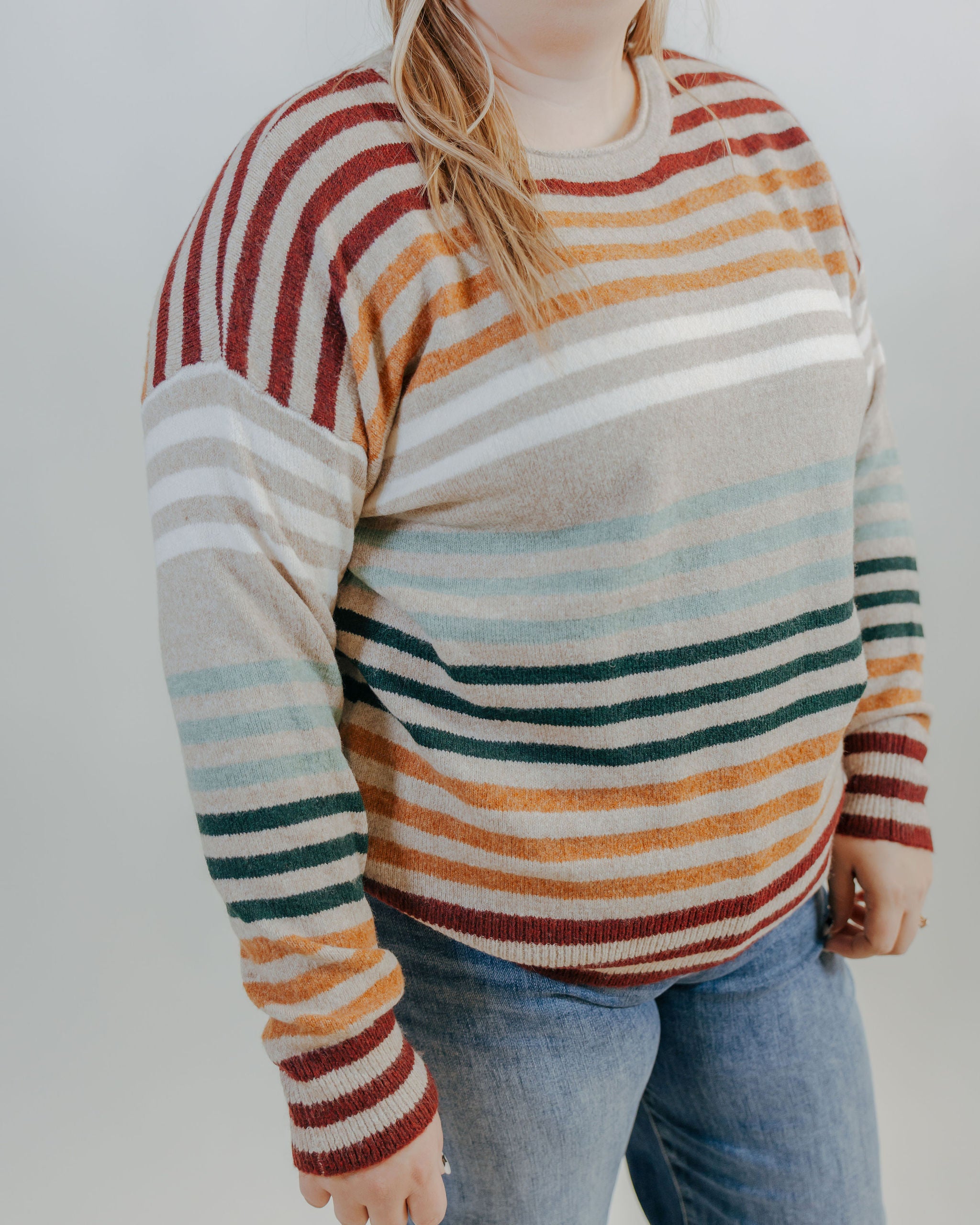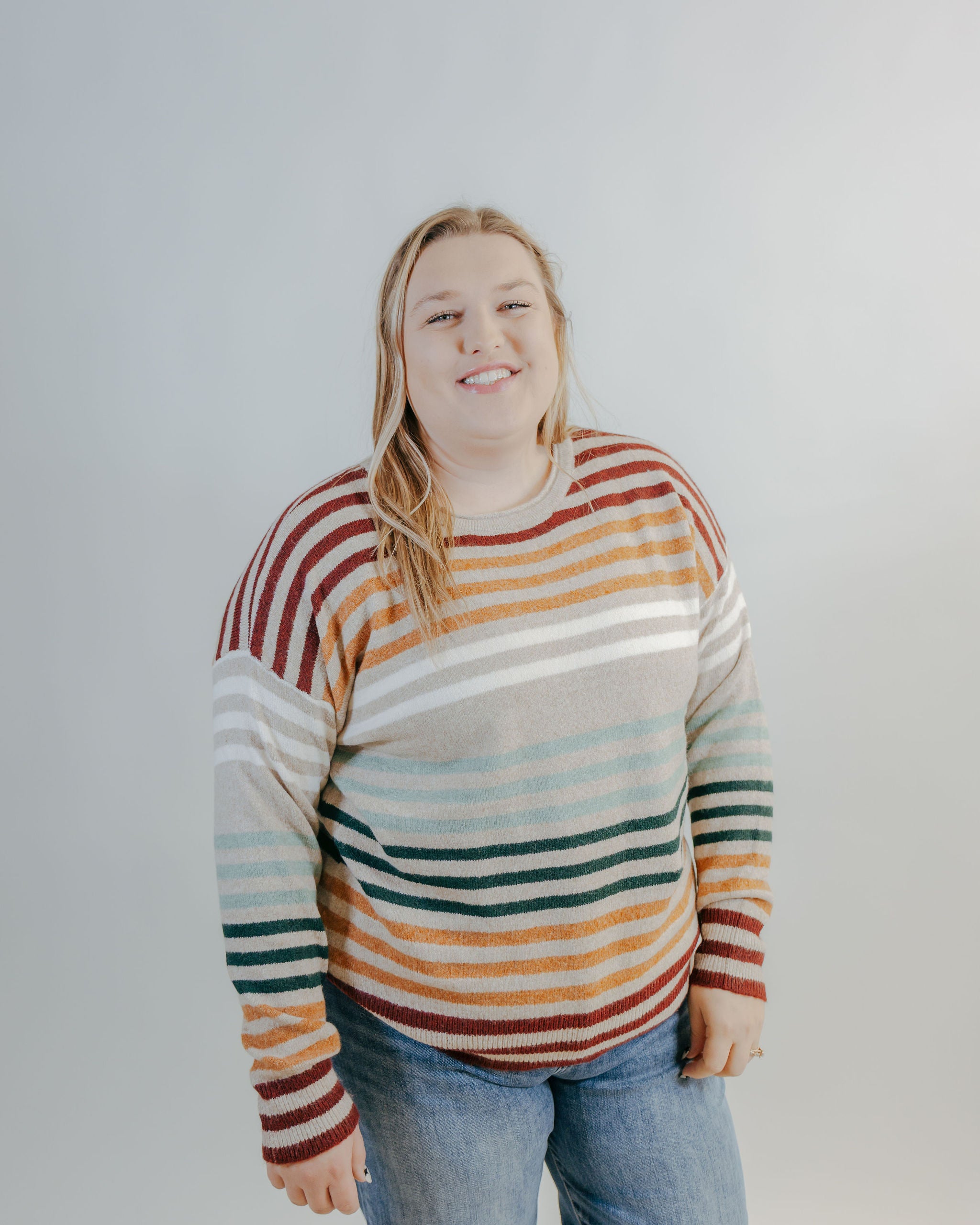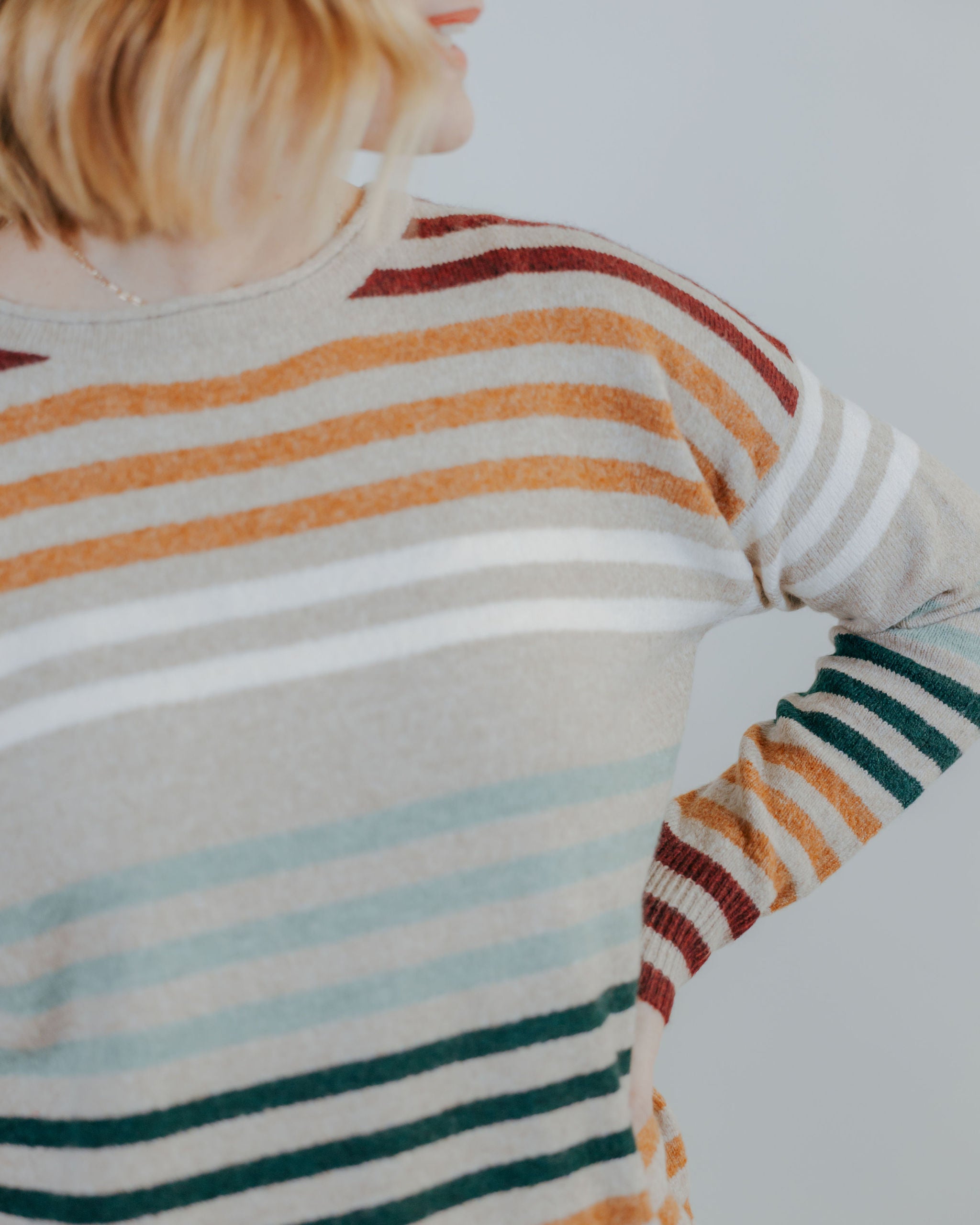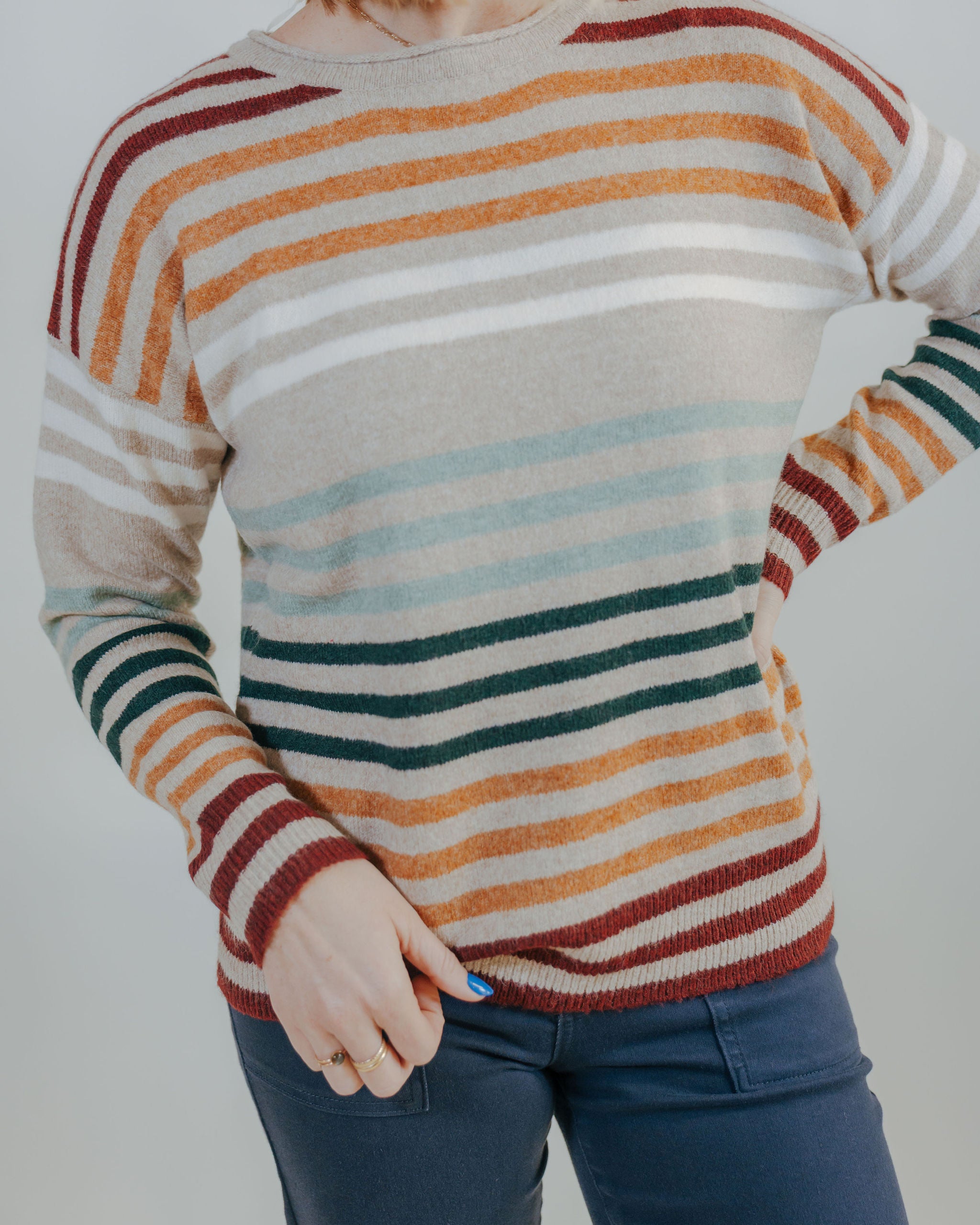 Wrap yourself in cozy comfort with the Muted Rainbow Sweater. Its super soft, stretchy fabric and taupe base adorned with gentle rainbow stripes make it an easy-to-wear favorite. Perfectly comfy and playful, this sweater adds a subtle pop of color to your everyday look without sacrificing ease.