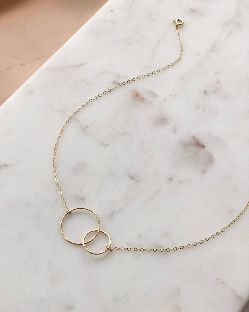 Two circles, hand-forged and lightly hammered, come together and hang from a beautiful chain.